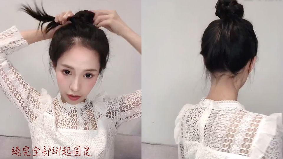 前面跟高馬尾的分段綁法一樣~唯一不同的是,全部綁好後,把頭髮用成麻花捲繞起來全部固定好,最後在整理後腦勺跟碎髮就可以啦!另外,針對頭髮偏稀疏的人,也有不同綁法哦!