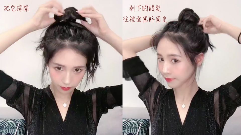 一樣先綁個高馬尾,盡量澎鬆不貼頭皮,然後在馬尾的1/3處用小橡皮筋綁住,再將馬尾往前翻,把剛剛分的1/3鼓起來變成一個包,再把剩餘的頭髮往裡面塞住固定就大功告成啦~
