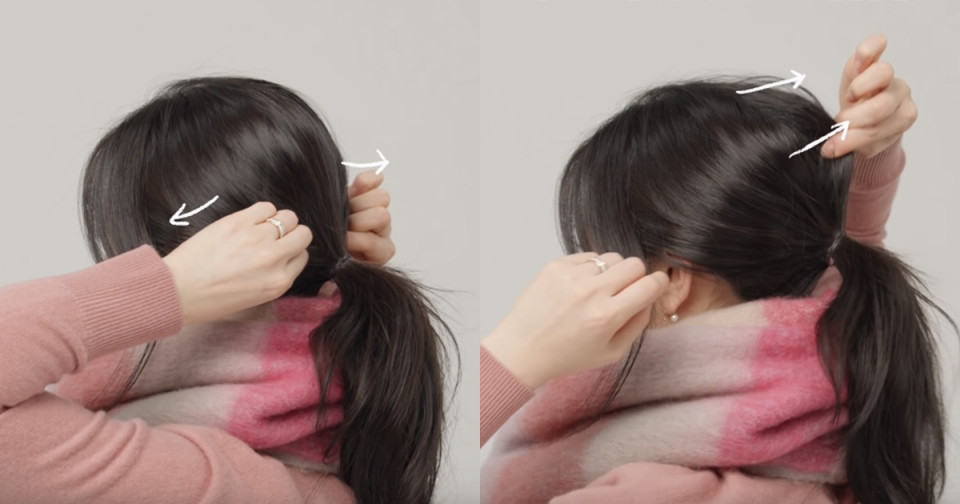綁好馬尾後有一個重點,就是兩邊耳朵上方的蓬鬆感,一般綁馬尾時只會注意頭頂、後腦勺的蓬鬆感,但是圍圍巾時、頭的長度會被拉長、就要適時加上一點寬度才修飾臉型,所以可以稍微拉出耳朵上方的碎髮,讓臉型更有修飾感。