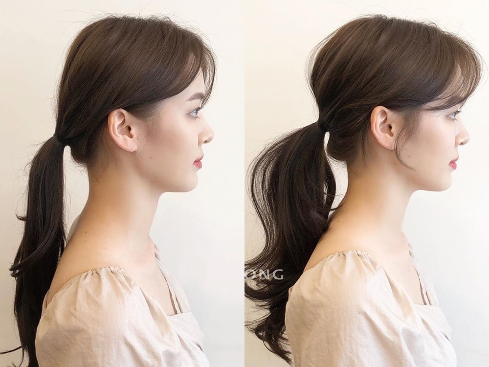 稀疏髮要綁馬尾,建議以扭轉的方式來增加馬尾份量,這個綁法可以綁出很有份量感的馬尾!先綁一個馬尾、最後將髮尾從中間反折進去即可,可以再稍微調整一下頭頂的蓬鬆感,讓頭型更加圓潤。