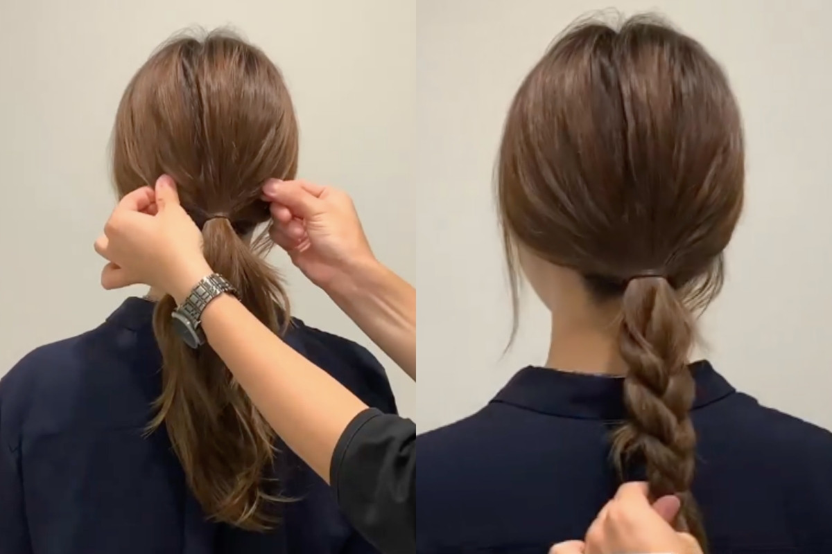 先綁出一個馬尾後,稍微調整頭型、抓出蓬鬆感,接著再將馬尾綁成一般的三股辮子。