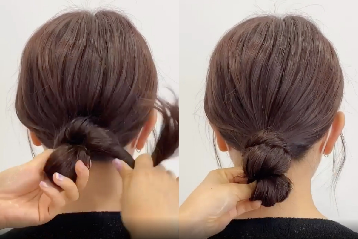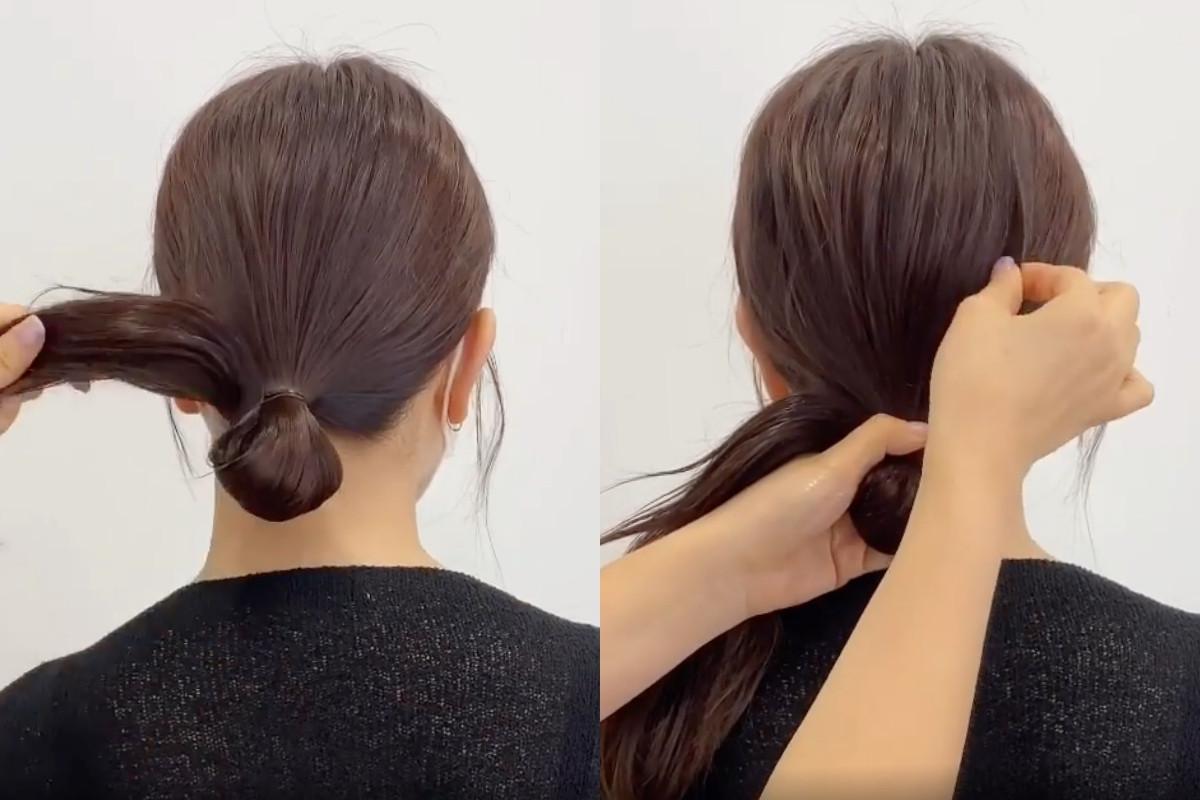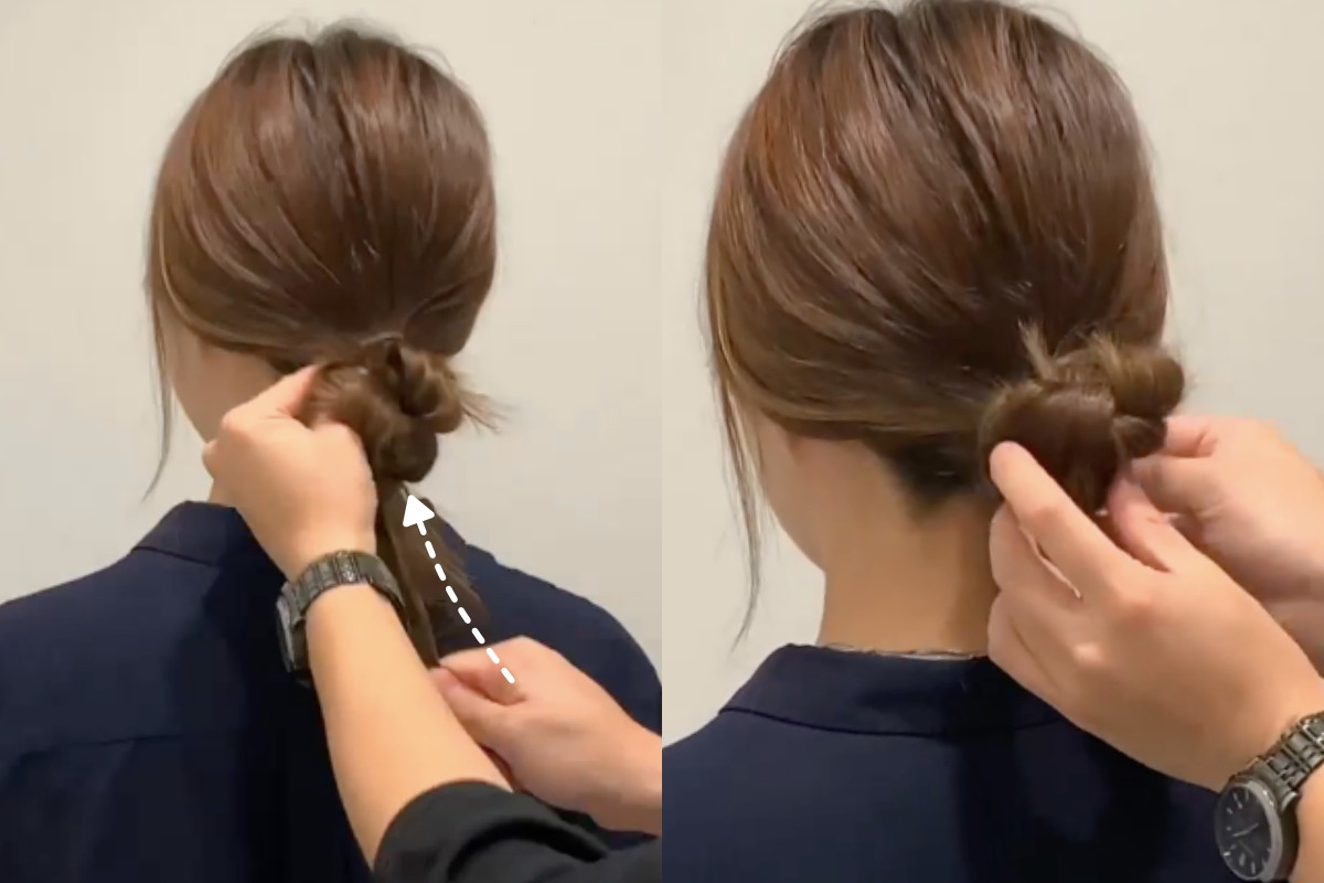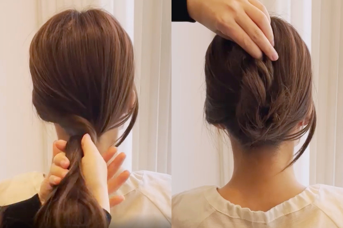 之後將剩下的頭髮扭轉成一束,再繞在髮圈部位,可以直接將髮尾藏進髮圈中固定、或是在另外用髮圈綁起。
