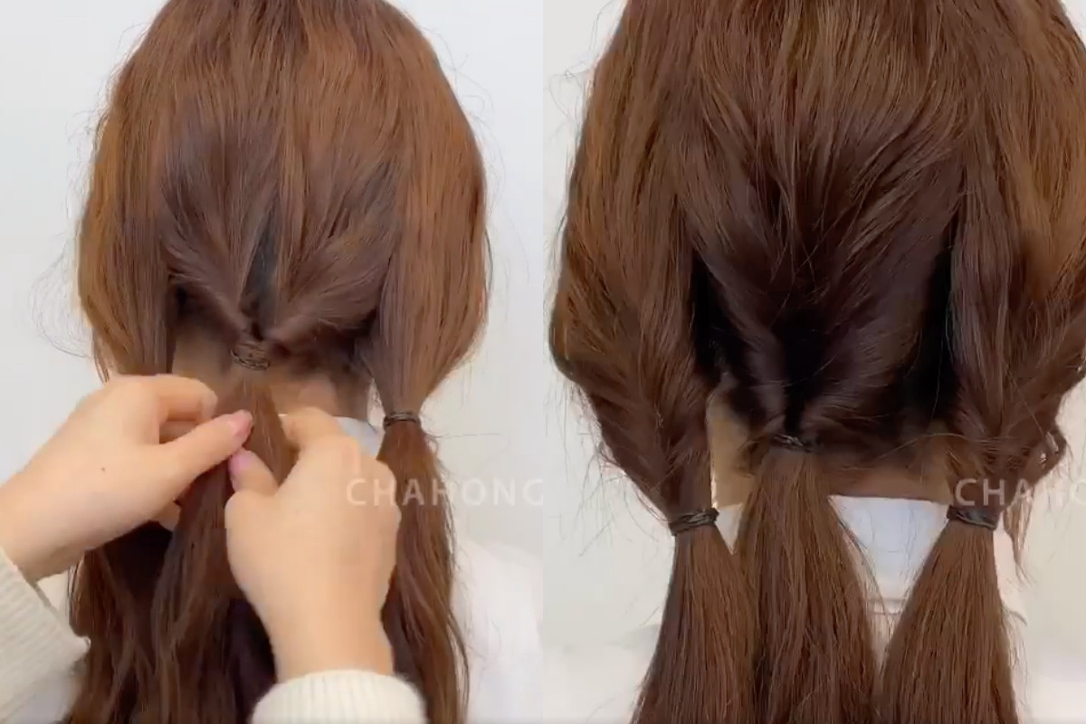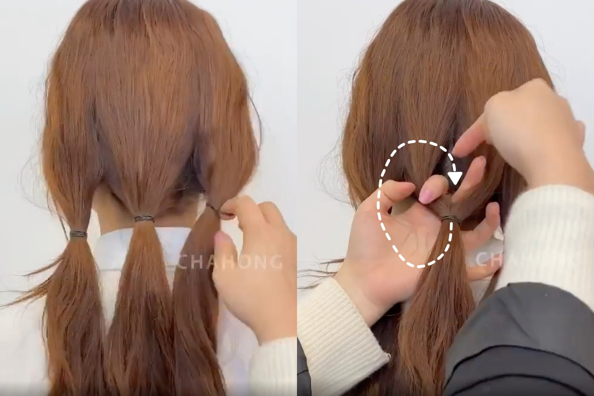 先頭髮分成中間、及左右各三束,之後再用髮圈綁起,將頭髮從中間穿過去,三束頭髮都一樣的方式從中間穿過。
