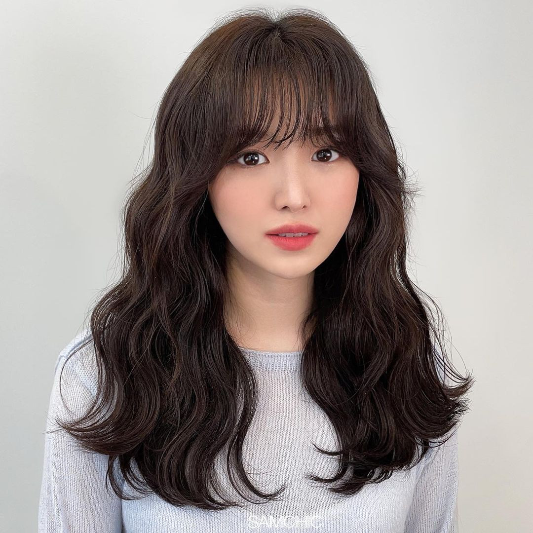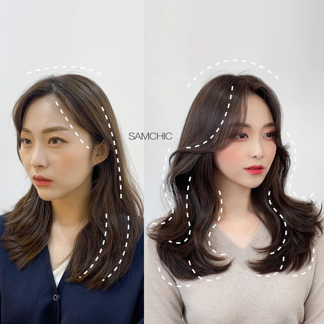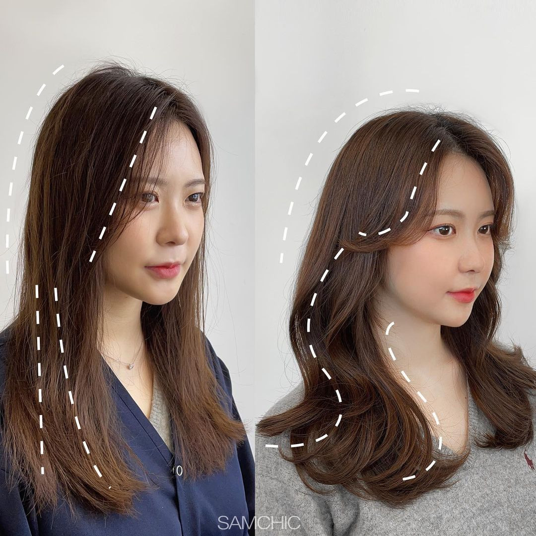 空氣娃娃瀏海建議一樣可以以髮捲製造出空氣感,透過弧度可以在視覺上起到修飾臉長的效果之外,也有透過空氣感起到弱化長臉帶來的老氣感的效果!