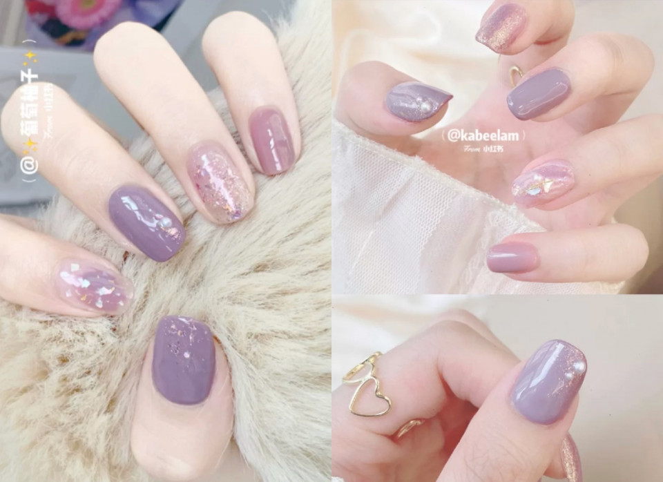 這款美甲以芋泥色搭配配殼閃片,加上透光紫的底色,讓雙手看起來超顯白啊!貝殼閃片搭配上透光紫底色,能讓甲床透出淡淡的粉色,看起來更優雅又有氣質!