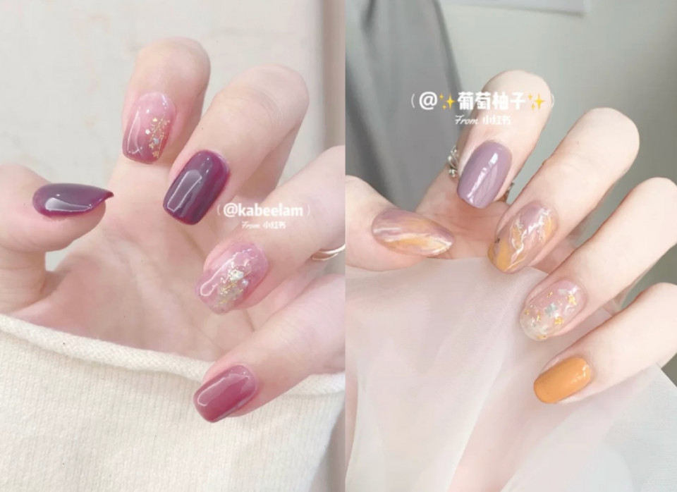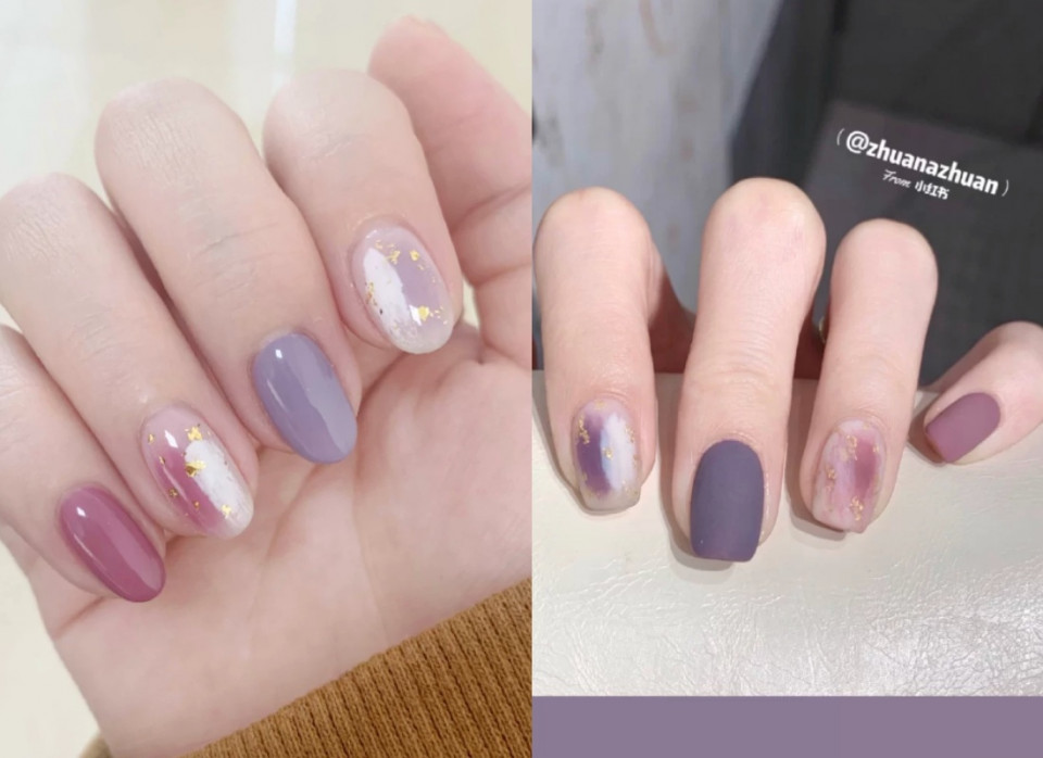芋泥色美甲搭配筆刷暈染就很有減齡少女感~想要可愛一點的美甲款式,選這系列準沒錯!如果想要看起來特別一點,可以搭配金箔元素作點綴,也可以做成霧面款式,出門完全不怕撞甲!