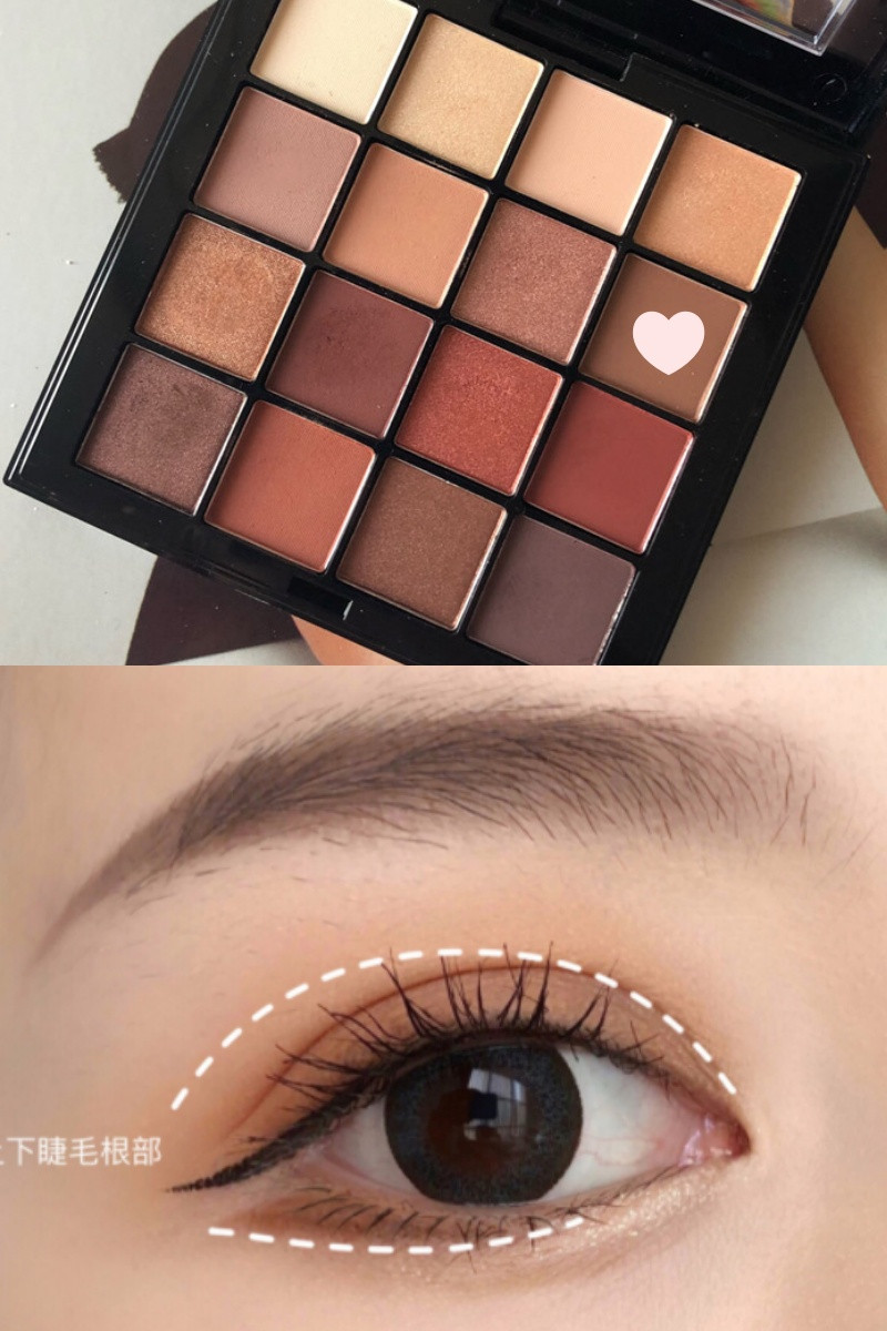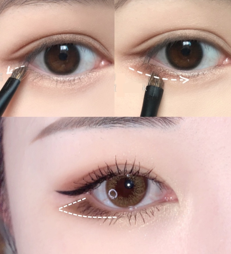 接著,我們要做最簡單版本的暈染:水平漸層。挑選淺褐色的眼影,加深上下睫毛根部,範圍窄窄的、約到雙眼皮摺痕處即可(單眼皮/內雙人,可以抓約在上眼皮1-3mm的位置)。下眼眶則畫在後1/3處。