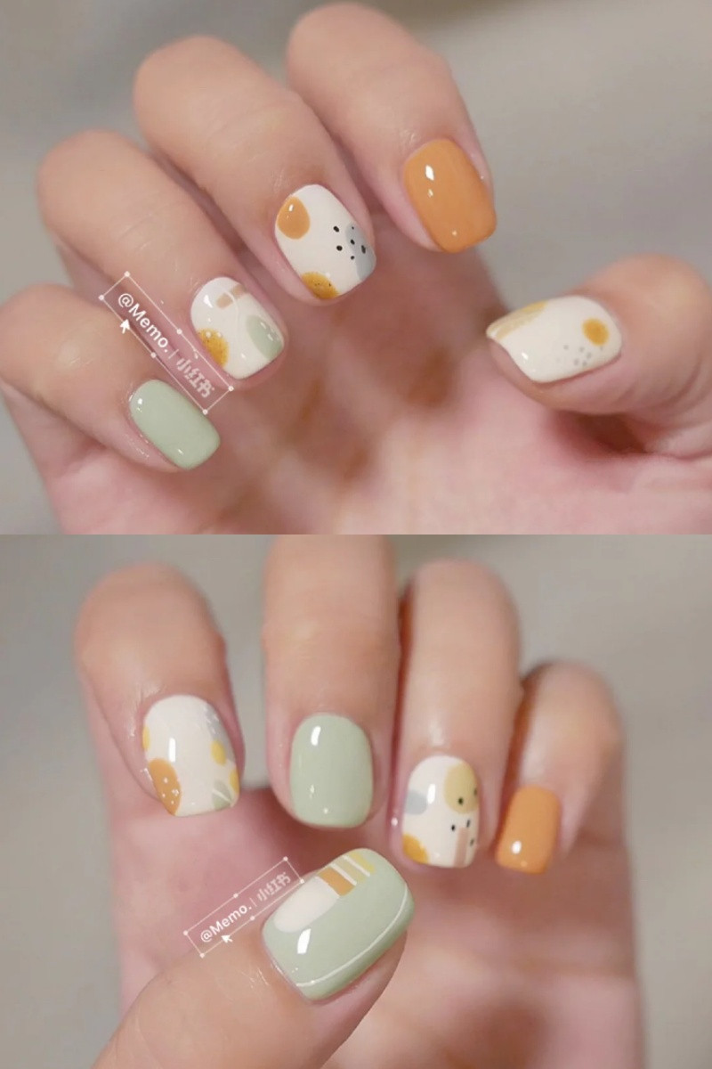 除了天空藍色,橘子調的美甲款式也很受到女孩們喜歡!結合了色塊、碎點並用線條連貫,看起來特別可愛有朝氣。