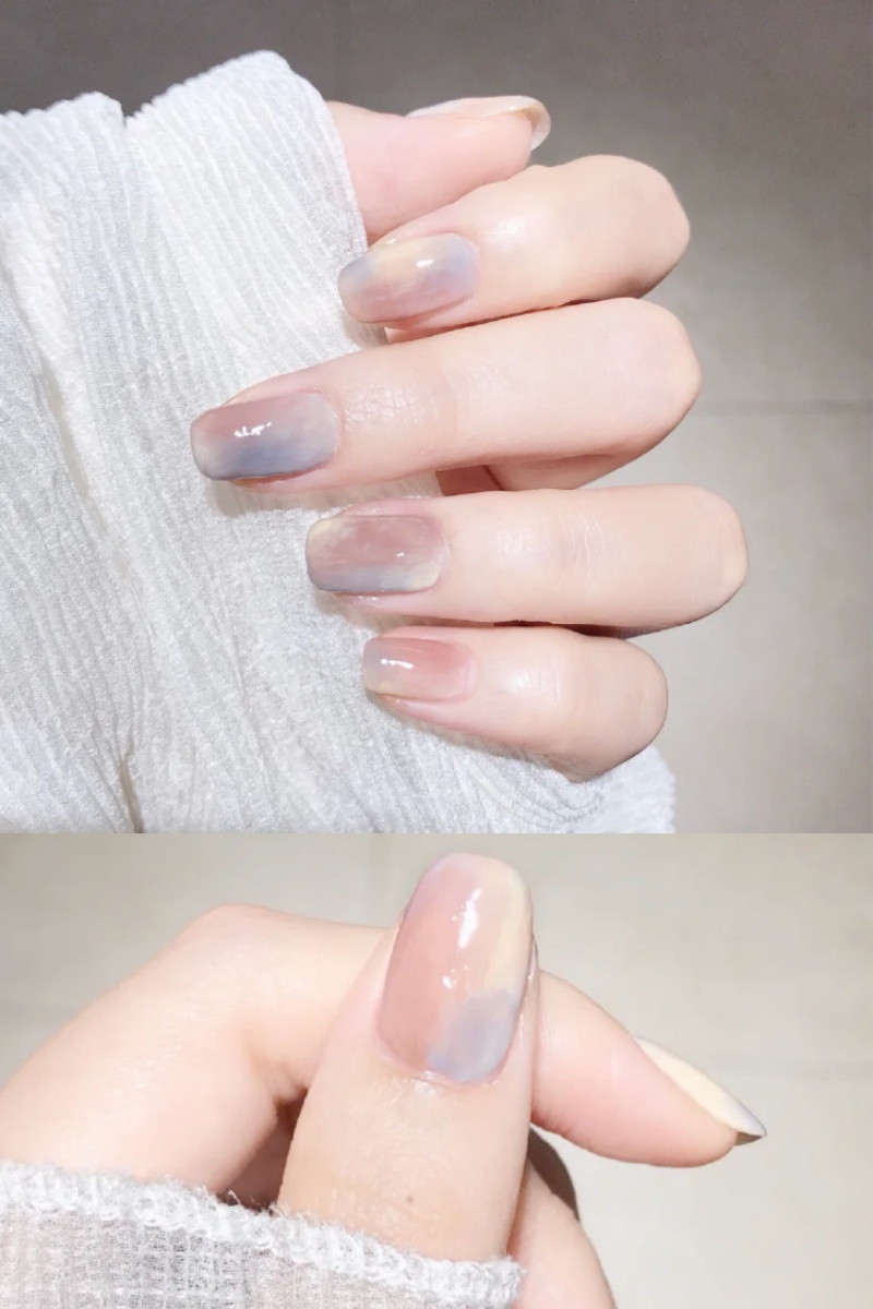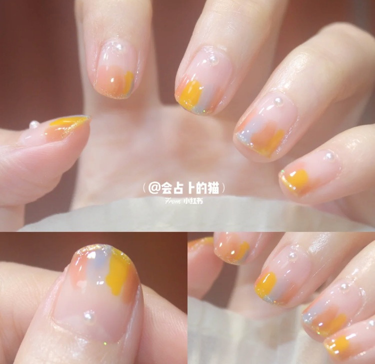 這款冰淇淋暈染好消暑!波光粼粼的蜜桃色、鵝黃色和寶藍做撞色,讓整個指尖低調又唯美。