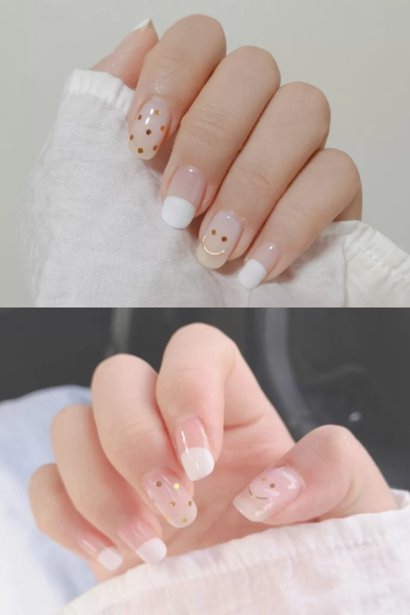 像是這款白色的留白美甲設計就高級到不行!半截的白色指尖,搭配上金箔點點和微笑臉,整體上充斥著初戀少女感,是款連男生都會喜歡的指彩!
