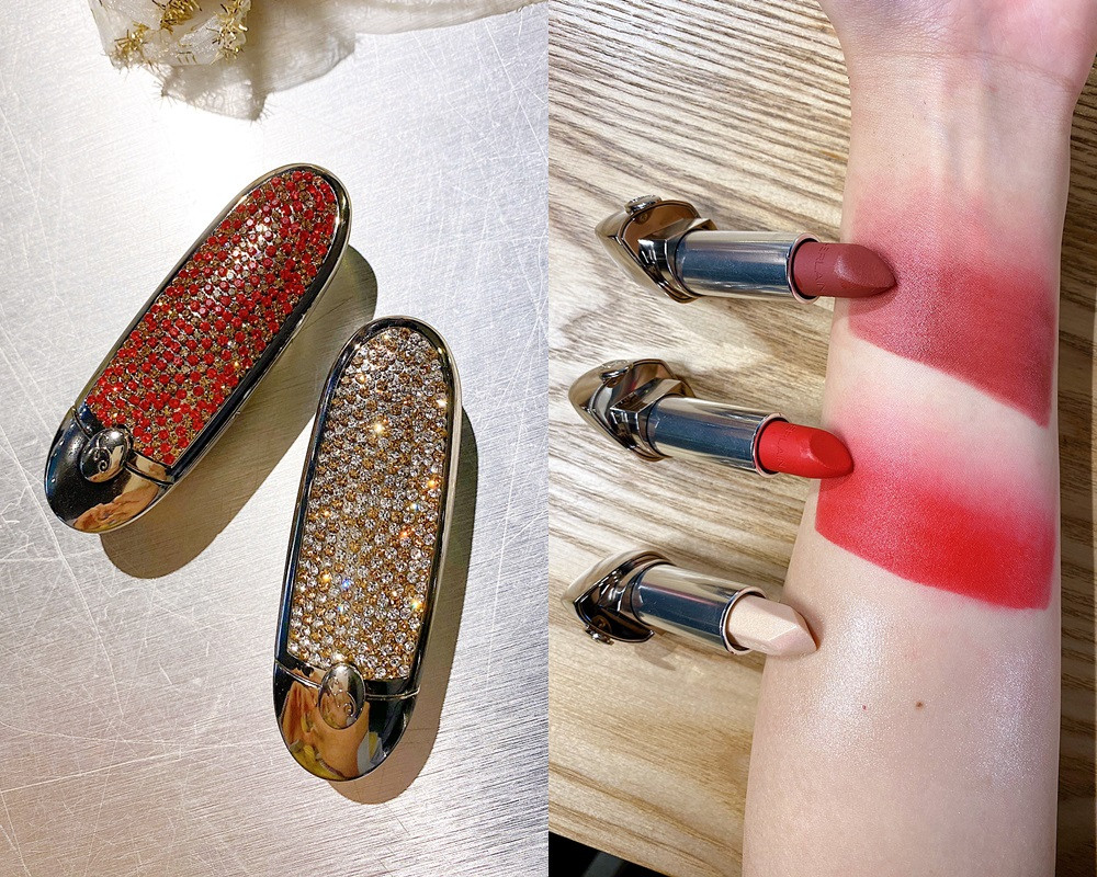 這次嬌蘭聖誕節推出全新的紅寶之吻高訂炫霧唇膏,唇膏表面皆刻有金耀舞蜂限量版蜜蜂圖案,讓唇膏看起來超奢華!#32是很正宗的冷調正紅,微微的絲霧感讓她一上唇就超美艷!同系列的炫霧唇膏#64則是一個很漂亮的木質粉色調,上唇後溫柔又顯白,就算素顏擦也不違和~除此之外另一款鑽石切面的紅寶之吻高訂唇膏#001,可以單獨使用,也可覆蓋在霧光唇膏上,膏體中帶有閃亮的鏡面光澤與細緻的金色粒子,一抹讓雙唇閃爍無盡的金耀光澤~除此之外,2020年聖誕節嬌蘭更特別設計了兩款布滿雙色晶鑽的全新Rouge G紅寶之吻唇膏彩殼,第一款Golden Ruby,特別選以金色與紅色雙色晶鑽,展現歲末佳節的歡慶氛圍;第二款Golden Diamond,飾以金色與銀白色晶鑽,帶出門絕對是滿滿的奢華感!