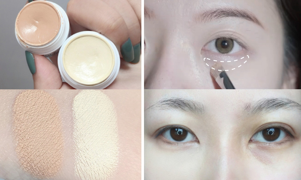 想畫出可愛奶感的臥蠶眼妝,眼影打底非常關鍵!上眼摺我們搭配眼影打底膏均勻暗沉膚色;下眼周處(到眼瞼)則選用比膚色明亮的遮瑕膏,以輕輕點壓的方式將黑眼圈與淚溝柔焦,如此能方便後續臥蠶可以更加顯色,也避免陰影處顯髒。
