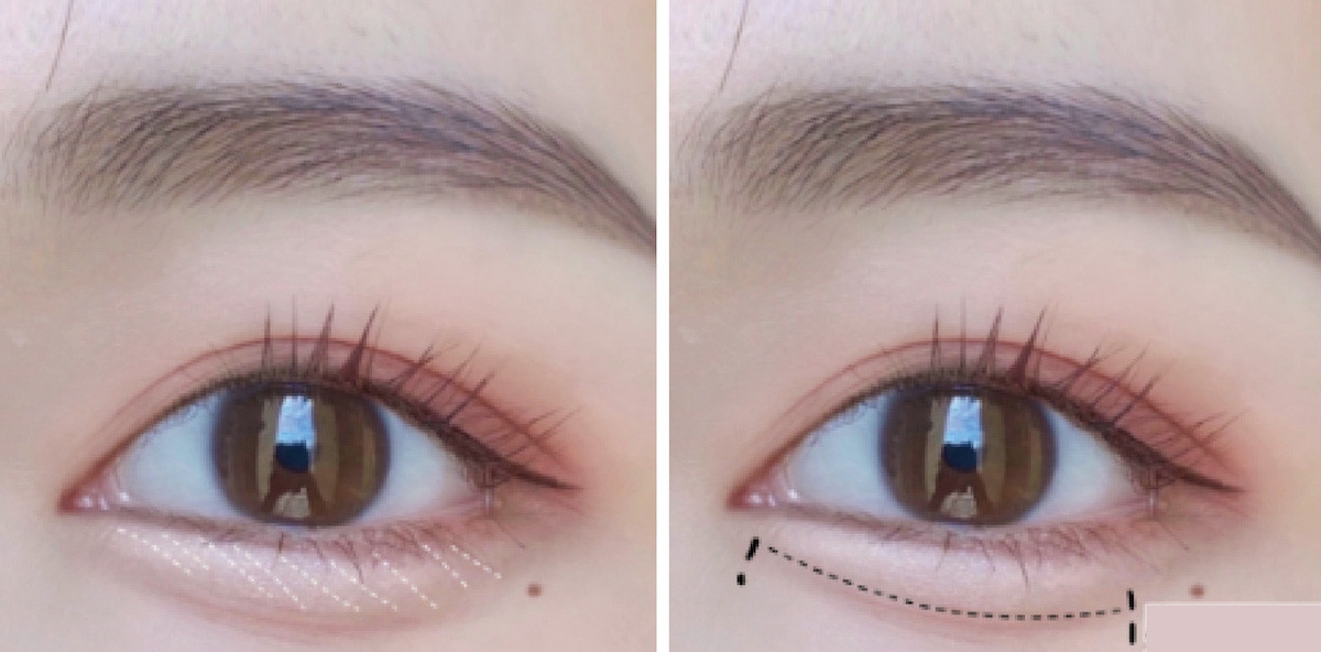 畫臥蠶時,先沾取緞光香檳色眼影,勾勒下眼瞼前端到臥蠶處。再用淺米棕色(或灰感的鼻影),畫在比本身臥蠶再上緣一點點的位置。這樣臥蠶才會更加自然、不突兀。