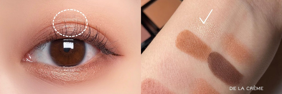 眼窩打底是許多初學者容易忽略的步驟,但卻是眼妝是否乾淨細膩的關鍵!我們先用大號眼影刷,染取裸膚或米色的霧面影眼,大面積的為眼窩鋪色。完畢後,我們也可以用同支暈染刷,針對雙眼皮遮痕之下做二次打底,增加眼窩深邃度。