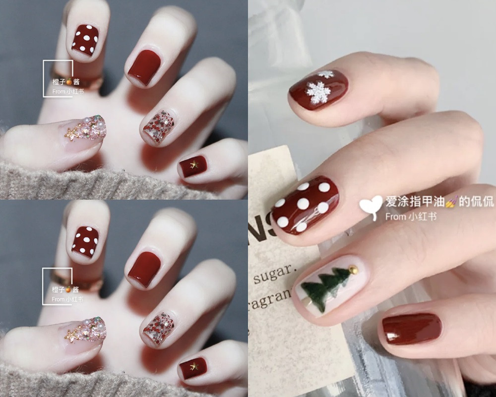 金蔥也是聖誕節非常常見的一個元素之一!這款美甲以較深的棗紅色搭配金蔥元素,讓雙手有閃亮亮的奢華感,但是又不會過於俗氣,如果擔心泰浮誇,也可以將金蔥當作點點綴,放在手繪的聖誕樹或是搭配素面聖誕紅底色,看起來就會很有質感!