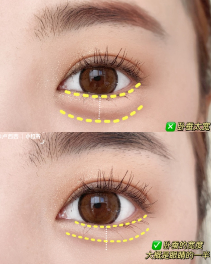 這是許多人會犯的錯誤,臥蠶不是越大越好呀!正確精緻的撒嬌肉,應該要根據我們的眼睛比例做調整,最恰到的寬度約為「眼睛的一半」,太大會像沒睡醒,眼睛看上去渙散無力。