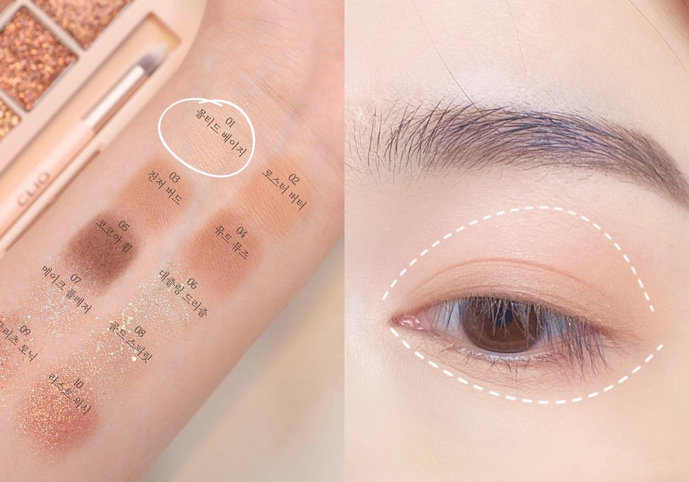 先選擇眼影盤中最淺、最裸的霧面色調,大範圍畫在整個眼窩及下眼瞼部位,其實在畫眼妝前,這樣的打底色可以幫助後續眼影更加顯色,暈染的層次感也會更明顯。