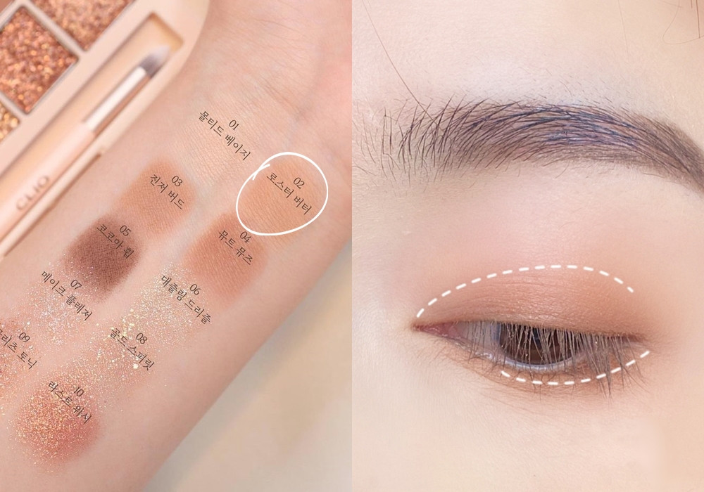 這種低妝感的眼妝,就是將妝感降到最低,以霧面淺裸棕色調的眼影畫出輪廓,僅用2色疊加、讓輪廓更加自然深邃,接著是重點:無中生有的臥蠶,透過提亮搭配陰影,打造出媽生感的臥蠶,像是原生臥蠶般自然。