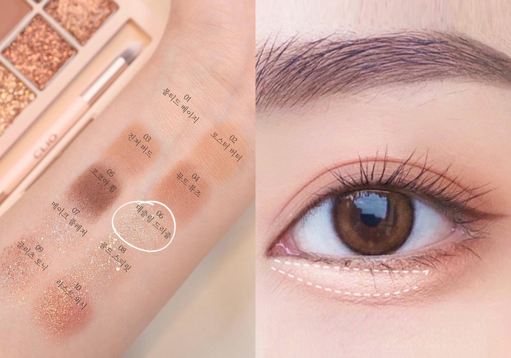 低妝感眼妝很重要的關鍵就在於臥蠶,畫的時候可以先笑一下、用力擠出臥蠶部位,以眼影中的珠光色畫在下眼瞼眼頭到眼球下方,不要超過眼球下方的位置,眼影珠光色調建議選擇偏膚金、珠光顆粒較細緻的色調,畫出來的臥蠶會更加自然。