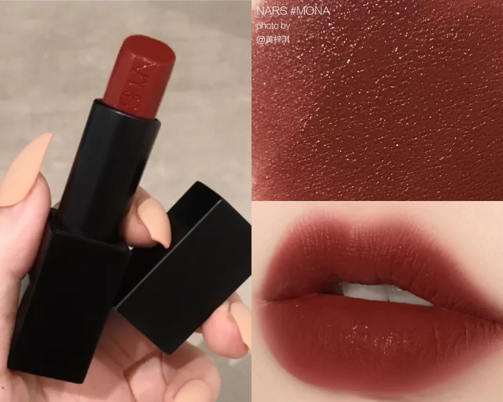 NARS的經典熱買紅茶棕色非#MONA莫屬!這一色不只在櫃上熱賣,在美妝版上也很紅~如果黃肌還在猶豫要買哪支顯白唇膏,選他準沒錯~他上唇後是絲絨妝感,滑順、服貼,又帶點微微的玫瑰調,不管白肌黃肌擦都顯白,完全不會有髒感!