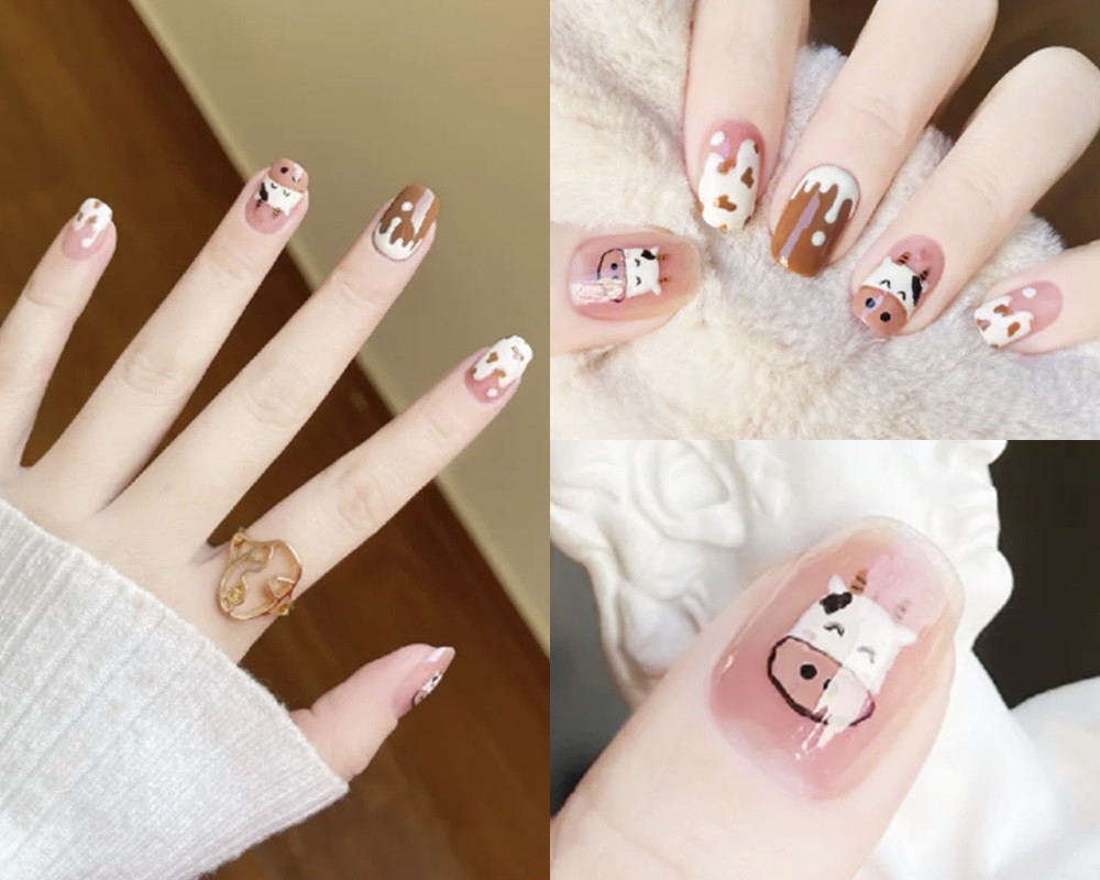 最後一款就是日常甜美又不挑人的莫蘭迪色系X牛牛美甲!莫蘭迪色系美甲屬於低飽和色調,對於黃肌來說非常友善,搭配上牛牛美甲,百搭又溫柔~就算過了新年也不奇怪!如果覺得只有牛牛太平淡,也可以搭配韓妞很喜歡的格紋美甲,看起來就很有韓系ins風~