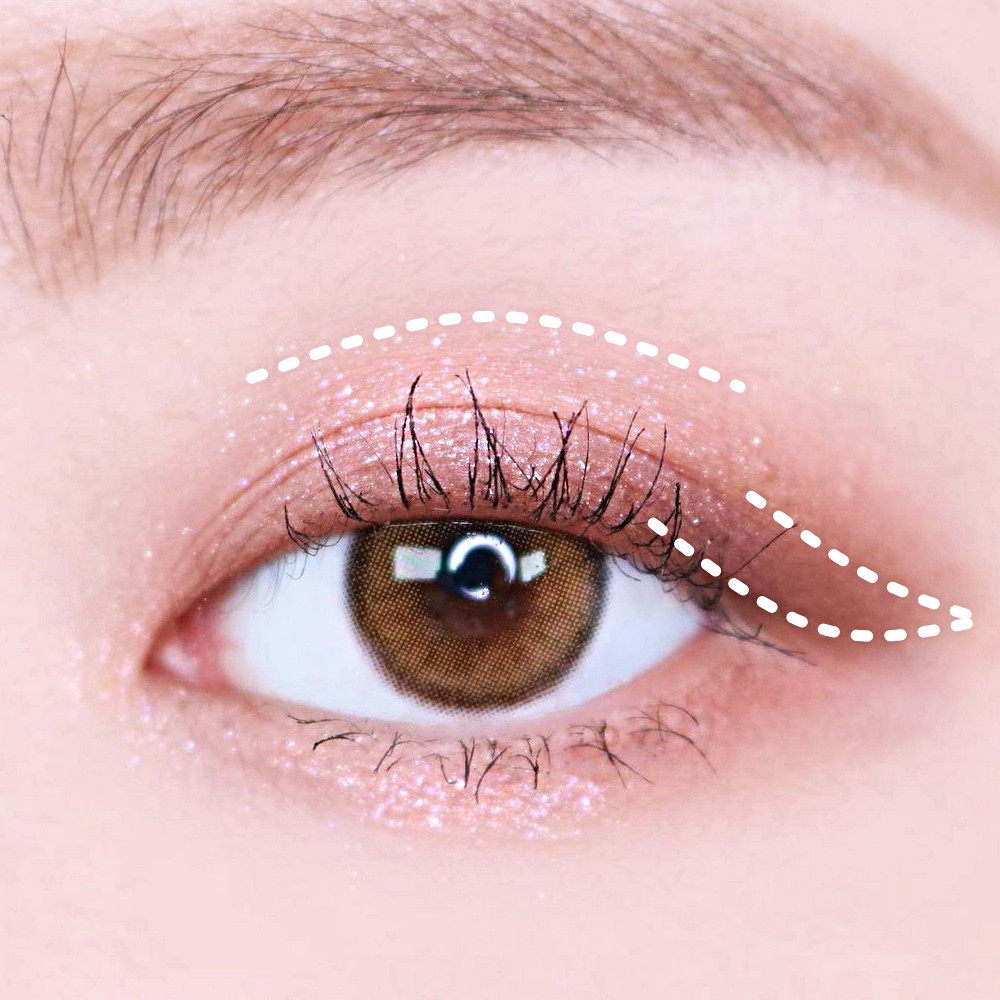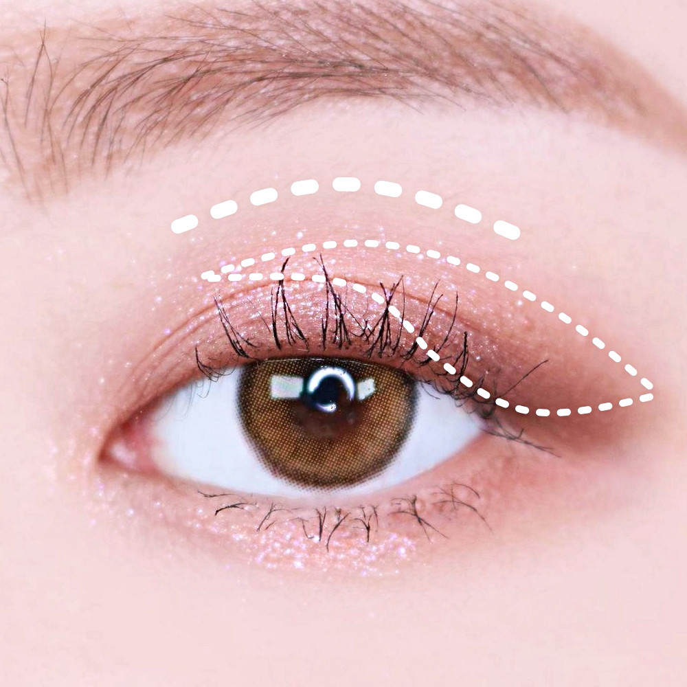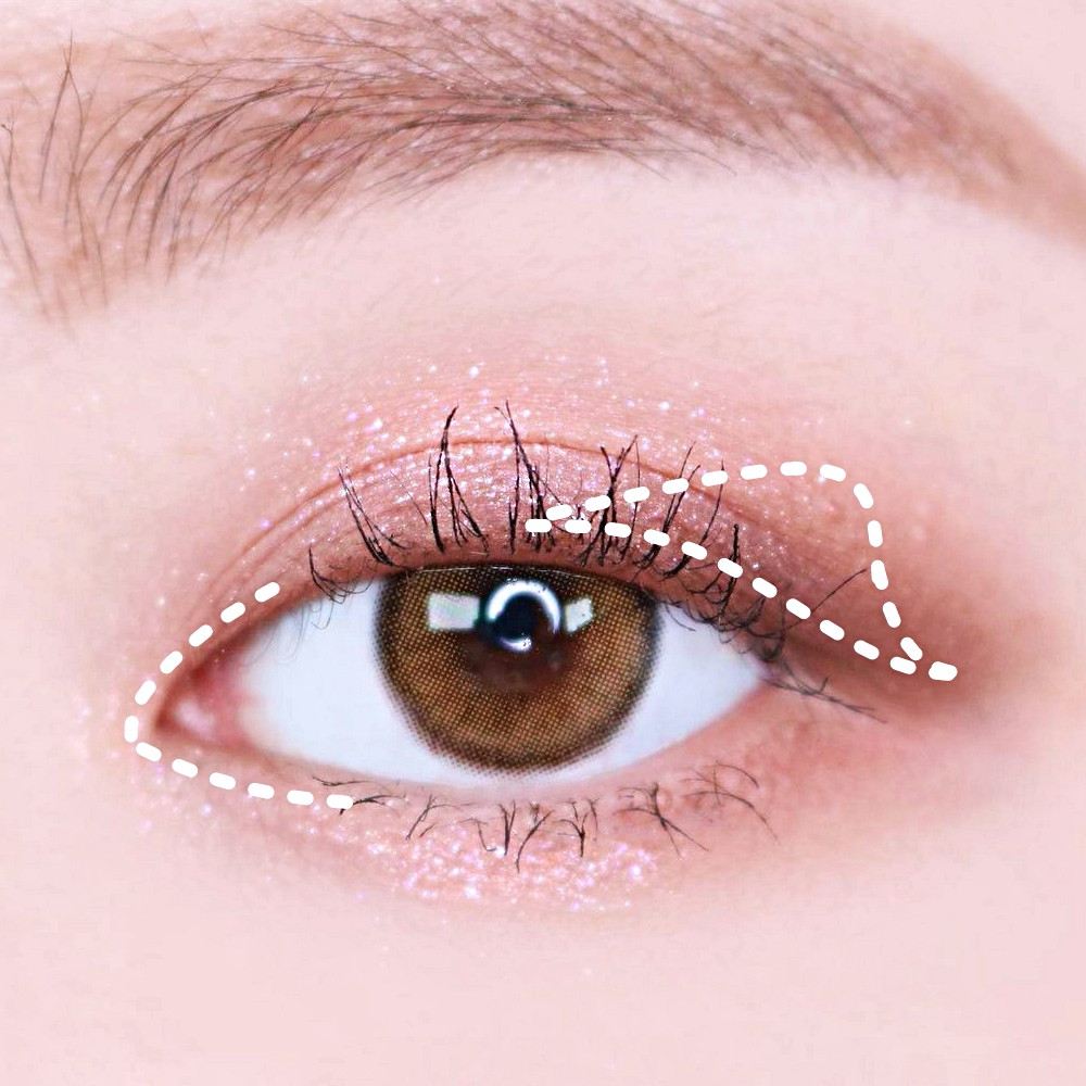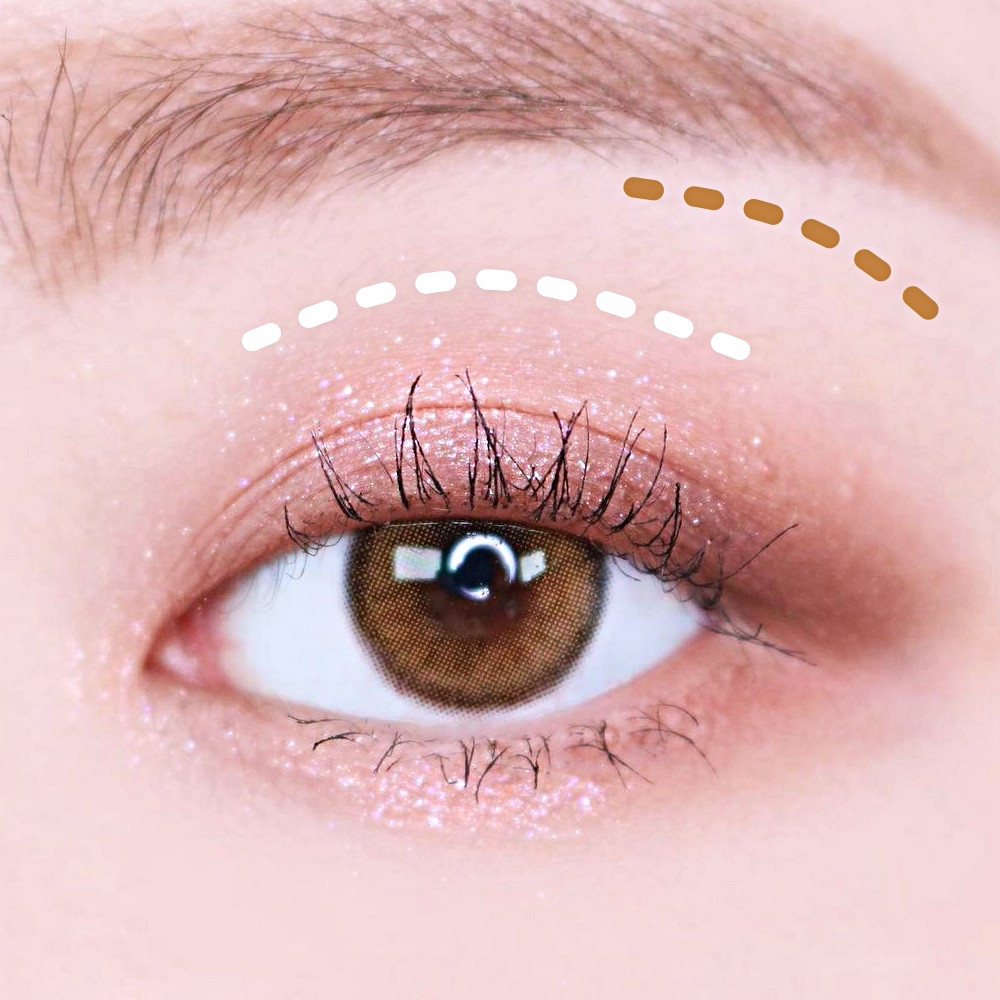 凹陷眼的眼型需要透過打亮與陰影,達到視覺上修飾凹陷感的效果,在凹陷的眼窩最深的那一條線上稍微畫上淺色、或亮色眼影當作打亮,而凸起的眉弓骨則畫上深色的陰影色,幫助凹陷的眼型有膨起的感覺。