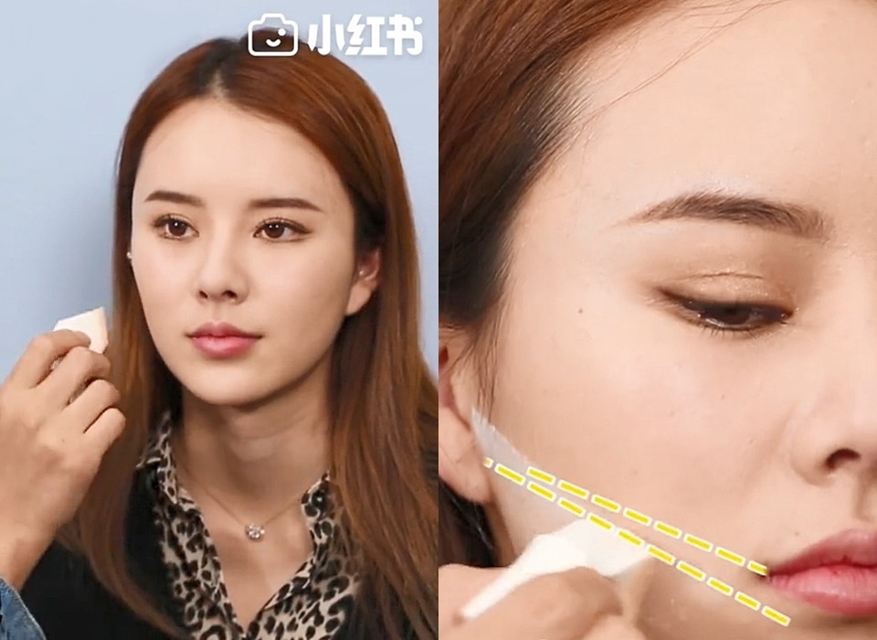 接著直接將蜜粉畫在嘴角-耳朵的線上,這條線是化妝師公認的「小臉修容線」,剛好位在顴骨下方與下顎的中間,不挑臉型、人人都適用!