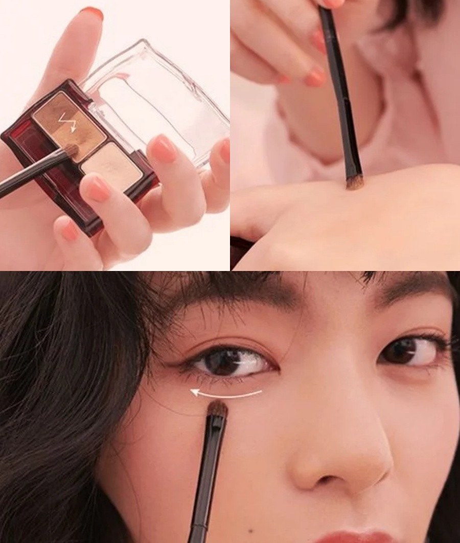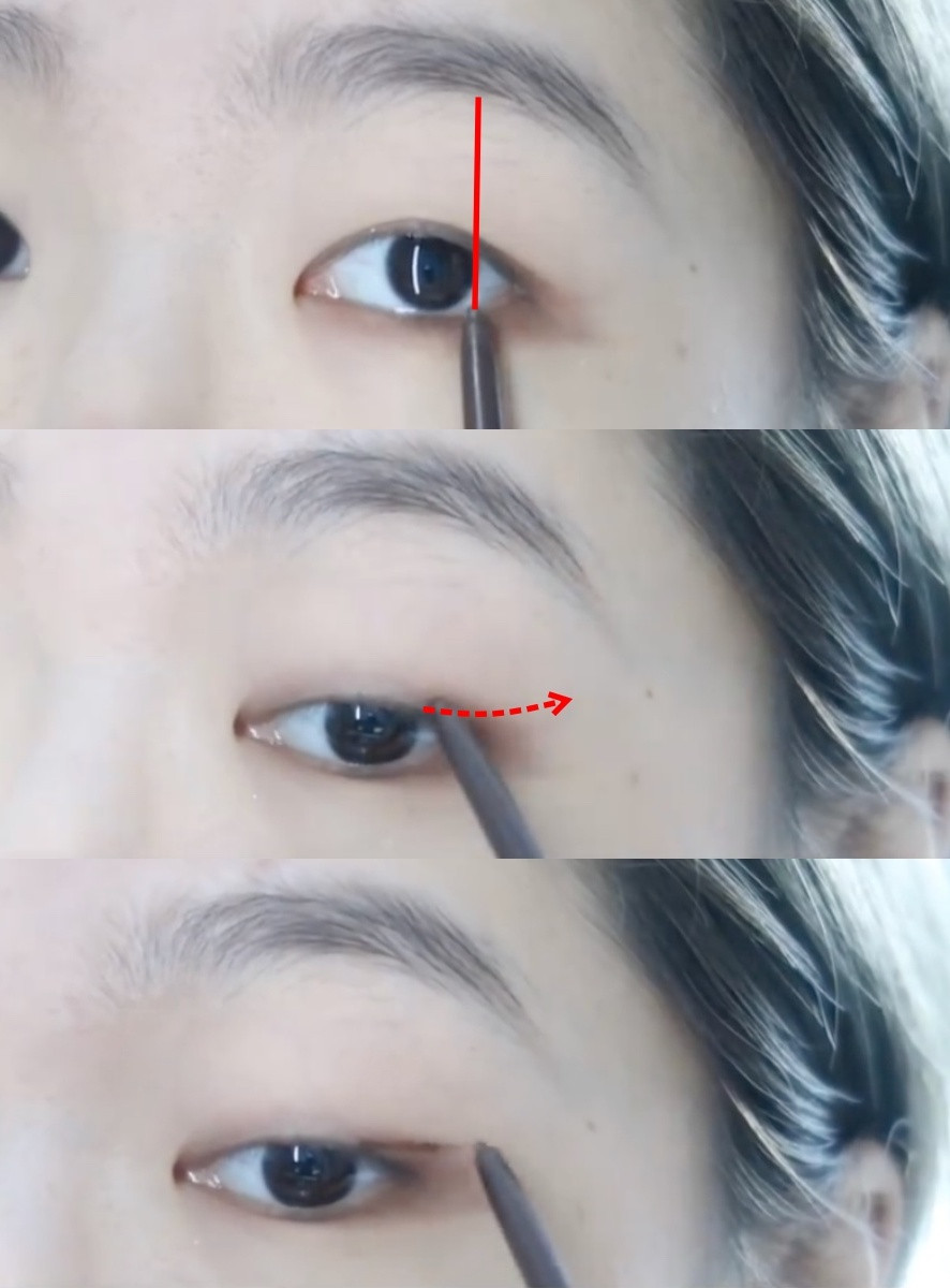 以扁平刷+眉粉是韓妞的秘訣,下筆之前可以先在手上畫幾筆減少粉量,製造的陰影便會夠細又不突兀。以眼球為中心點,先往後平畫一條線,不超過眼尾、不往上畫彎;再用棉花棒稍微模糊陰影線條,並輕刷往眼頭拉。