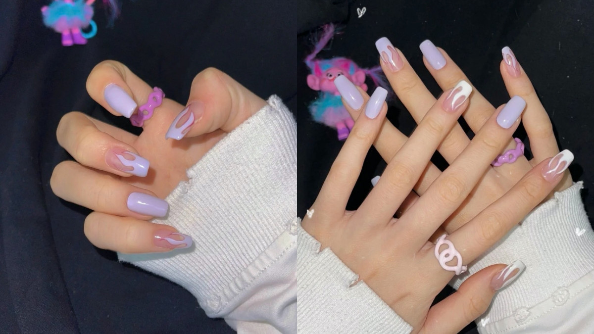 歐美女孩最愛的火焰款式當然也沒缺席!香芋奶紫加上火焰元素與方形美甲,穿戴上飾品看起來更加俐落率性,是一款可鹽可甜的款式。