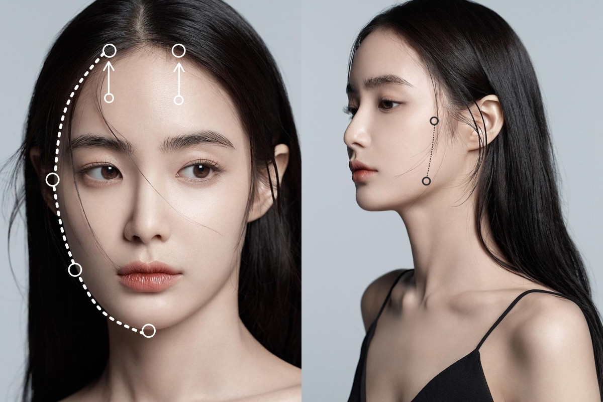 常常聽到顴骨外擴等等,精準自測方法就是正面先標記出側邊臉型中看上去最外側的部位(通常落在顴骨上下),接著畫出下顎角的部位(注意是以正面、單純從視覺上來看,所以畫的點不會是真的下顎角部位),接著是用手摸到額頭最突出的部位、垂直往上延伸到髮際線後標點,這幾個點就是撐起你面部走向的架子,觀察臉型最外側部位及下顎角的線條,如果真的太傾斜、往外出去太多,說明有顴骨外擴的問題,但如果只是超微偏一點,甚至下顎角是微微往內,那麼哪怕你的顴骨往外或是方臉、你的整個臉形其實視覺上看都是窄的,不用刻意修容也可以!