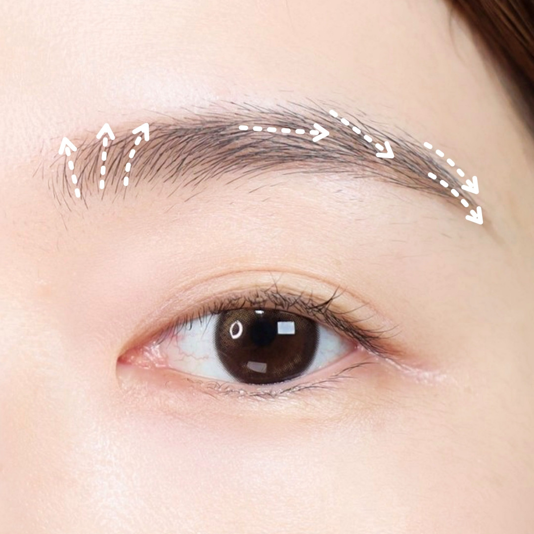 剛剛畫出毛流是為了先描繪整個眉型,接著再填補毛流線條及原生眉毛間的空隙,一樣以眉筆在空隙部位補上毛流線條,只需要再明顯的空隙補上短短的線條即可,