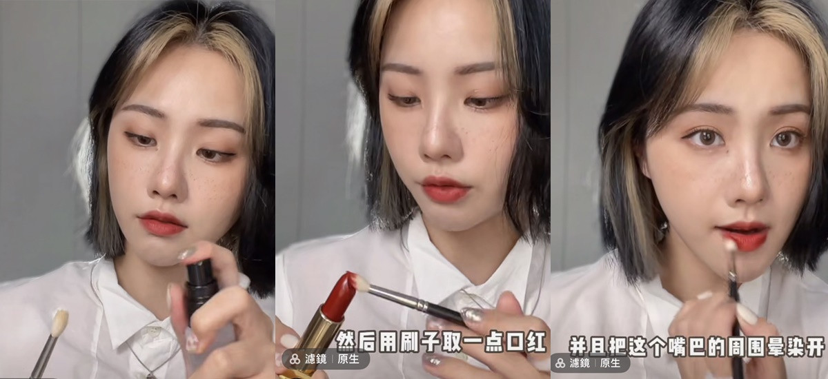 水潤型唇膏定妝技巧3:定妝噴霧+唇刷