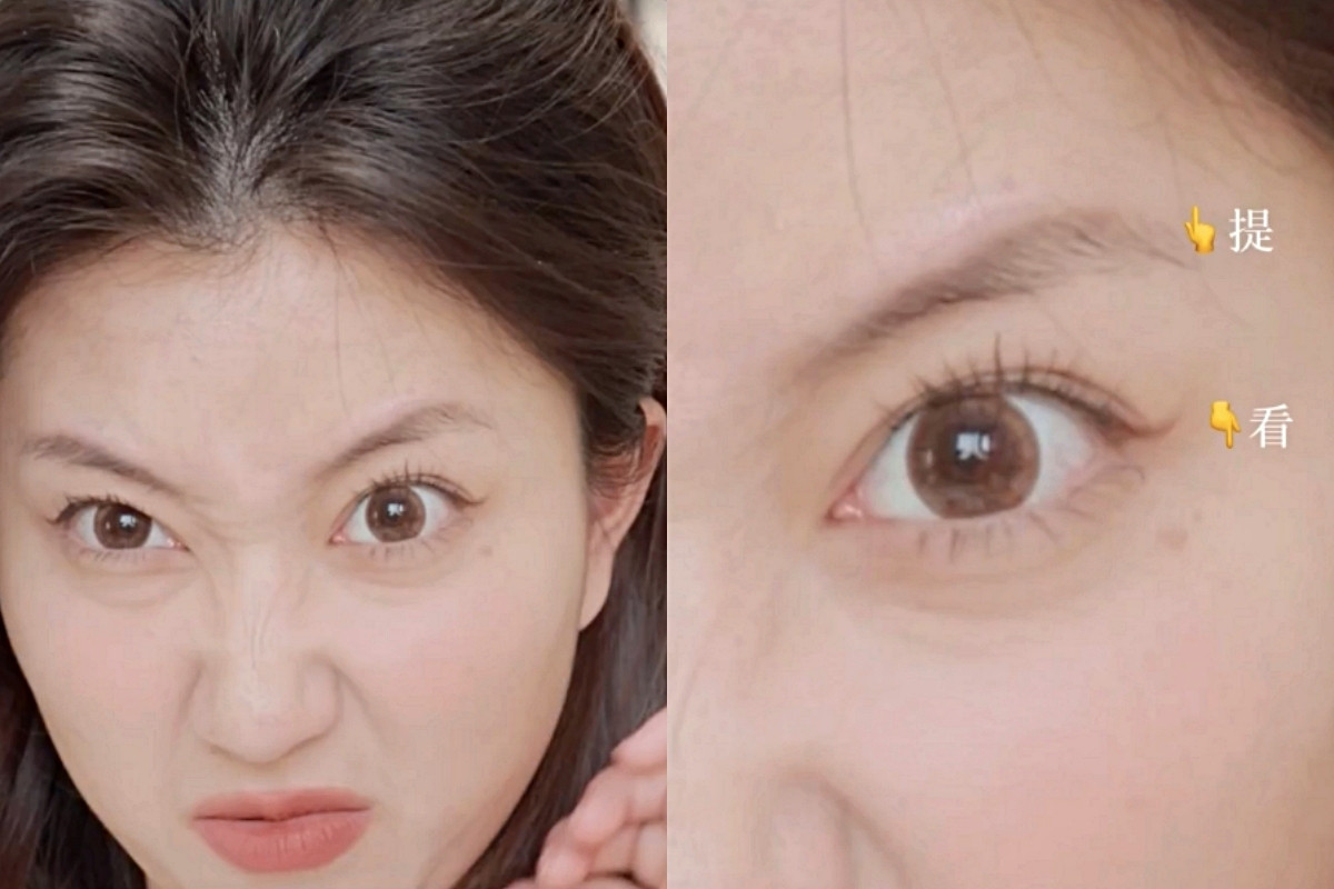 骨相畫眉顧名思義,必須將眉毛畫在骨相的位置上,所以會更接近原生眉型、是最適合也不挑人的眉型,找到眉毛骨相位置前,可以做出這種擠眉弄眼的動作輔助找出眉型,將眉毛上提、同時眼睛向下看,之後以這樣的表情為基準,可以看出整個眉毛的骨相及眉型走向。