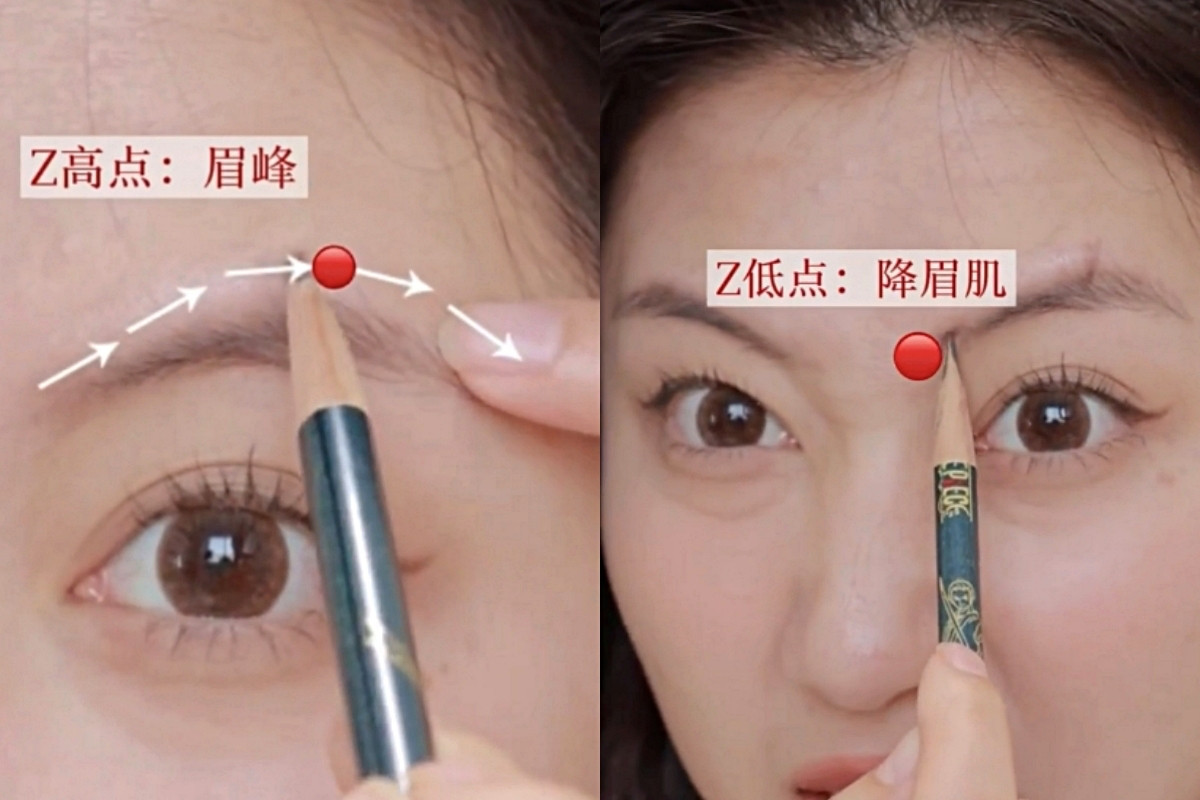 一樣用手稍微捏住「眼輪匝肌」,在最高點的位置用眉筆稍微畫出記號,這就是眉峰的位置,接著手指往眼頭方向摸、約與鼻樑銜接部位會有一個低點,這就是眉頭的位置「降眉肌」,一樣也先用眉筆標記出來。