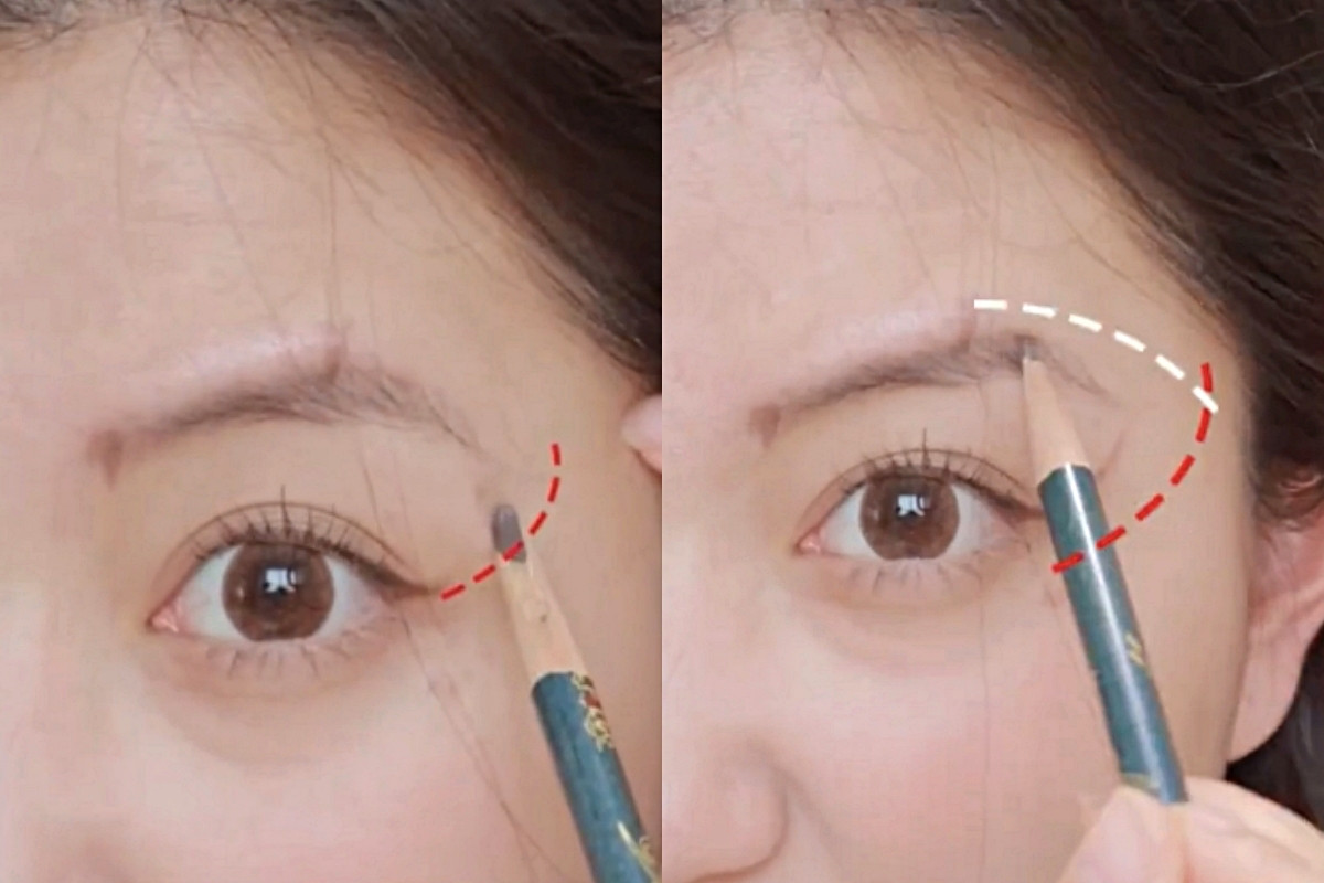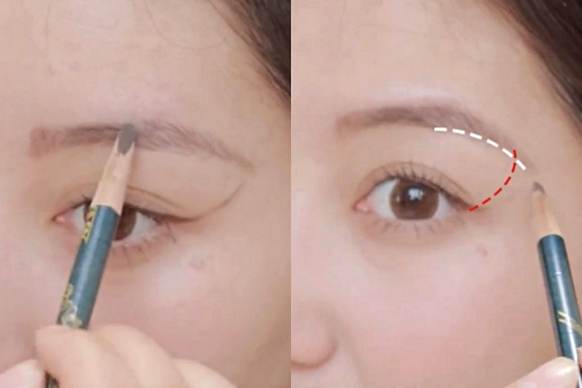 眉尾的位置怎麼看?正確的眉尾位置落在眼尾與「眼輪匝肌」的銜接處,順著眼輪匝肌畫出一個往下的圓弧、再從眼尾稍微畫出往上的圓弧線,兩線相接的部位就是眉尾,這樣找出的眉尾位置是比較適合骨相的眉毛長度,也說明了為什麼會說眼尾眼線延伸剛好切齊眉尾最剛好。