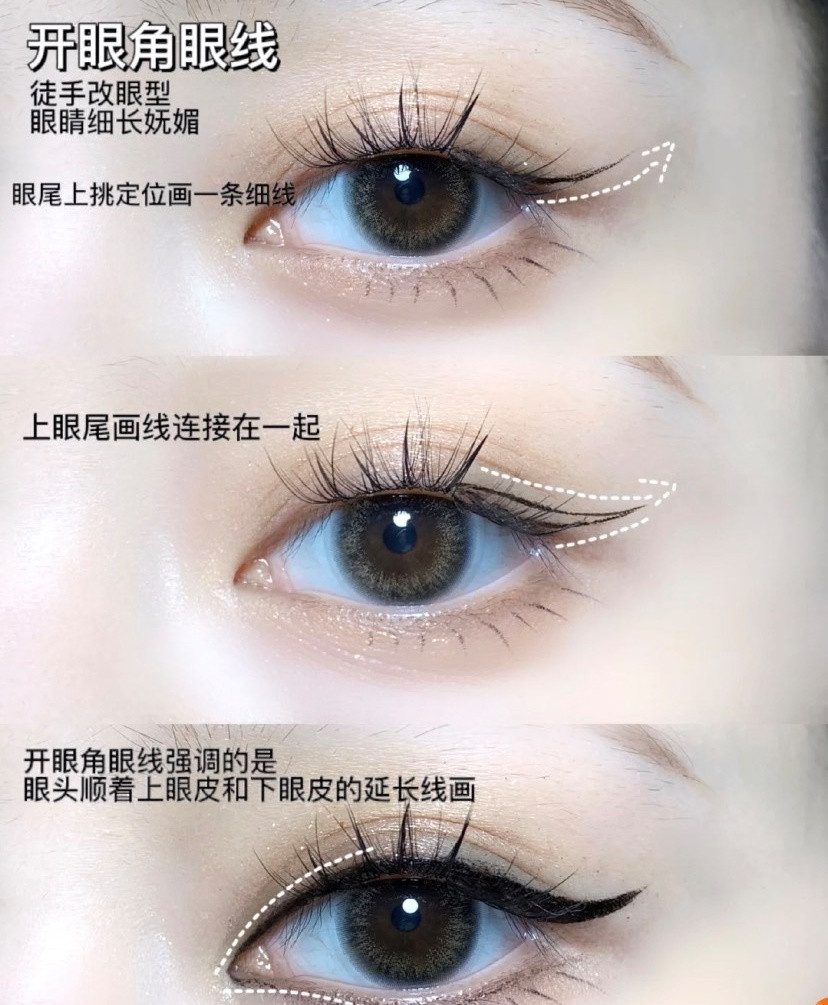最後,則是矯正眼型Top1的「開眼角眼線」從眼尾畫一條上挑細線,接著再從上眼尾後1/2畫上眼尾線與之連接,並填補空隙,接著再順著眼型填補內眼線,來到內眼角時可以再往前延伸畫一個小三角形,多了這個開眼角的動作,可以橫向放大雙眼,特別適合寬眼距、瞇瞇眼女孩,不用整形就能視覺調整眼型,實用度破表!