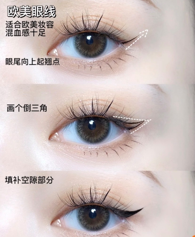 第四款「歐美小貓眼線」則是上一款的變奏版,同樣從眼角畫出上挑線,接著在眼尾直接畫出一個倒三角,並填補空隙,多了這個三角,放大雙眼的效果更加明顯,近期流行的釣系眼線、幼態貓系妝感都屬於這個範疇,搭配大地色、深色眼妝,更是撩人的極致,想要化身行走桃花發電機,這款必學!!