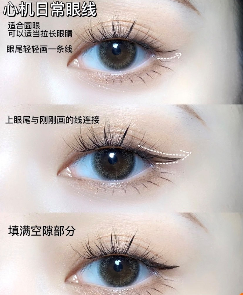 再更進階一點,我們可以試試「半截式日常眼線」直接從眼角輕輕平拉一條線,接著再從上眼尾後1/3平拉一條線與下眼尾線連接,再稍微填補一下空隙就完成啦~這招半截式小編趕時間的時候也超愛用,搭配日常淡妝百搭萬無一失,還能橫向放大圓眼,讓眼睛看起來更放電。