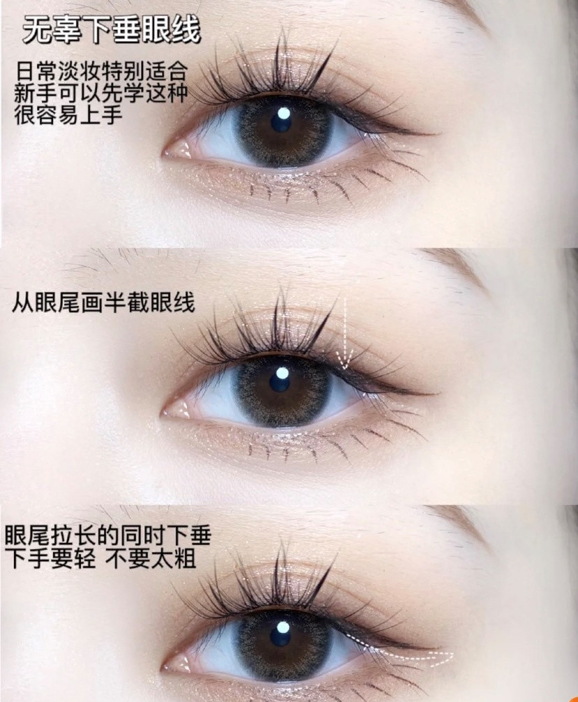 百搭的無辜下垂眼線非常萬用,只要從眼尾後1/3之一順著眼型畫眼線,線條可以自然下垂,筆觸盡量放輕、不要太用力,這樣的畫法就能自然延伸眼線,宛如天生麗質難自棄。
