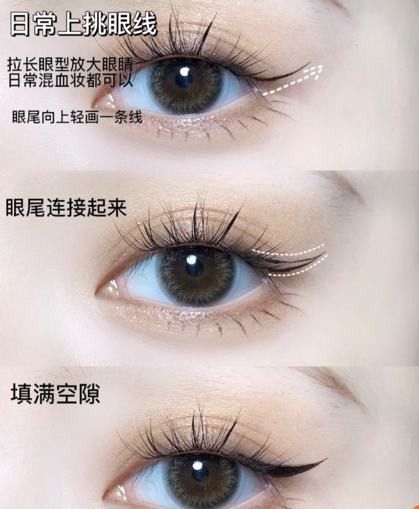如果是腫泡眼女孩,那麼這款「上挑眼線」絕對會是你的菜,只要下眼尾輕輕畫一條向上的線,再從後眼尾1/3連接起來,填補空隙就大功告成了,這種上挑畫法可以讓眼線更明顯,不怕被腫眼皮吃光光。