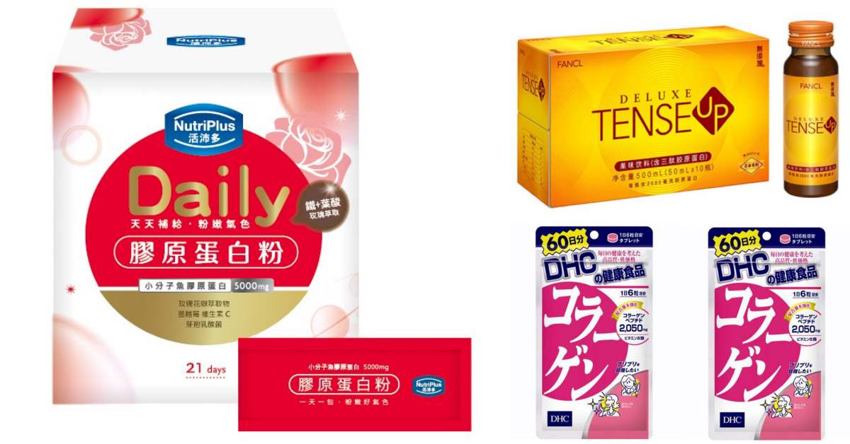 (右下)DHC 膠原蛋白:若上述兩款你都嫌麻煩,那就考慮膠囊吧!只需配水服用,別再拿很懶當藉口。這款一直是《DHC》家藥丸類的暢銷品之一,以萃取自魚類膠原蛋白為原料,並添加維生素B1、B2等營養素,可養顏美容常保青春美麗。