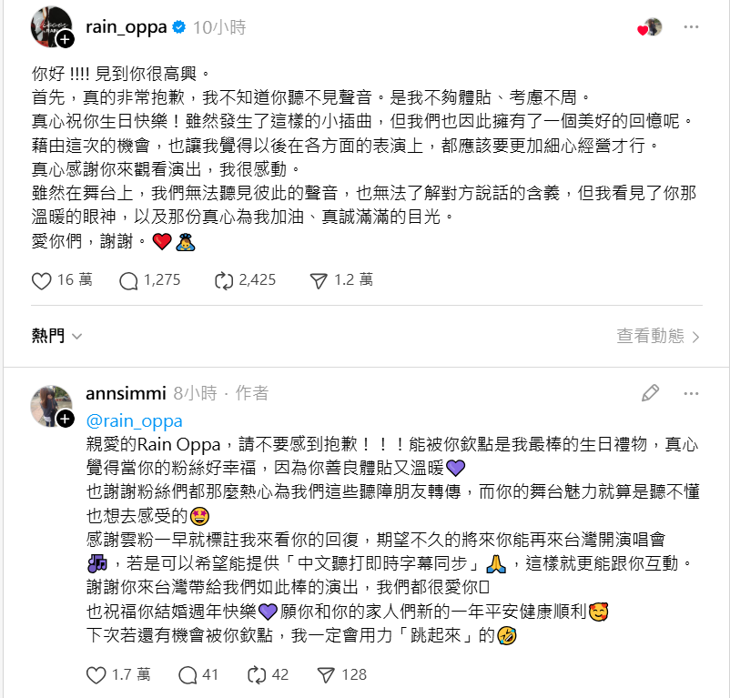 沒想到不到一天,Rain親自在Threads回覆,並使用完整繁體中文長文向粉絲致歉。他表示自己並不知道對方聽不見聲音,坦言是自己考慮不夠周全,也藉此反思未來在舞台互動與演出細節上,應該更細心顧及不同觀眾的需求,字字句句誠懇,讓不少網友直呼真的太暖。