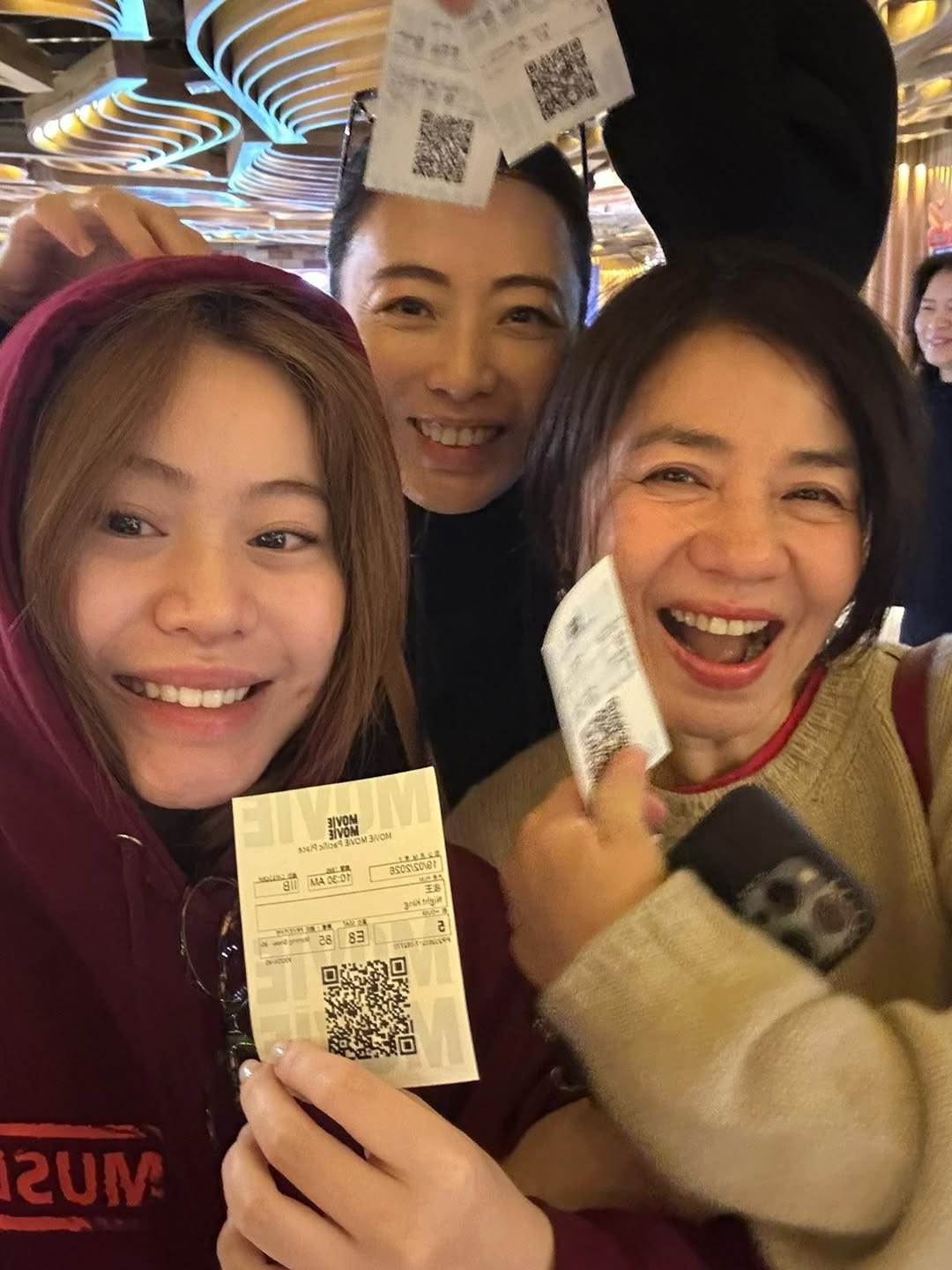 鍾楚紅(右起)和富太陳凱韻(甘比)及其大女兒劉秀樺一起看鄭秀文主演的《夜王》。圖片來源:IG@kimbeechan_offic