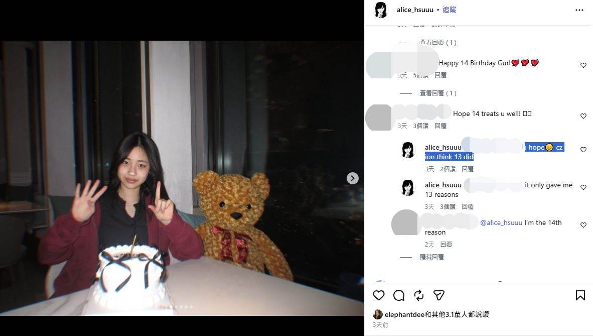 雖然許老三這則照片貼文瘋吸萬人按讚,也吸引兩個姊姊Elly許曦文、Lily許韶恩按讚送祝福,甚至釣出小S逗趣留言「恭祝皇后~福泰安康」,還有人寫道:「Hope 14 treats u well.(希望14歲對你好一點)」,但許老三卻感嘆回應:「cz ion think 13 did(我不認為13歲對我很好)」,複雜心情讓人不免聯想,可能和去年13歲時,經歷姨媽大S(徐熙媛)驟逝有關,令人感到不捨。