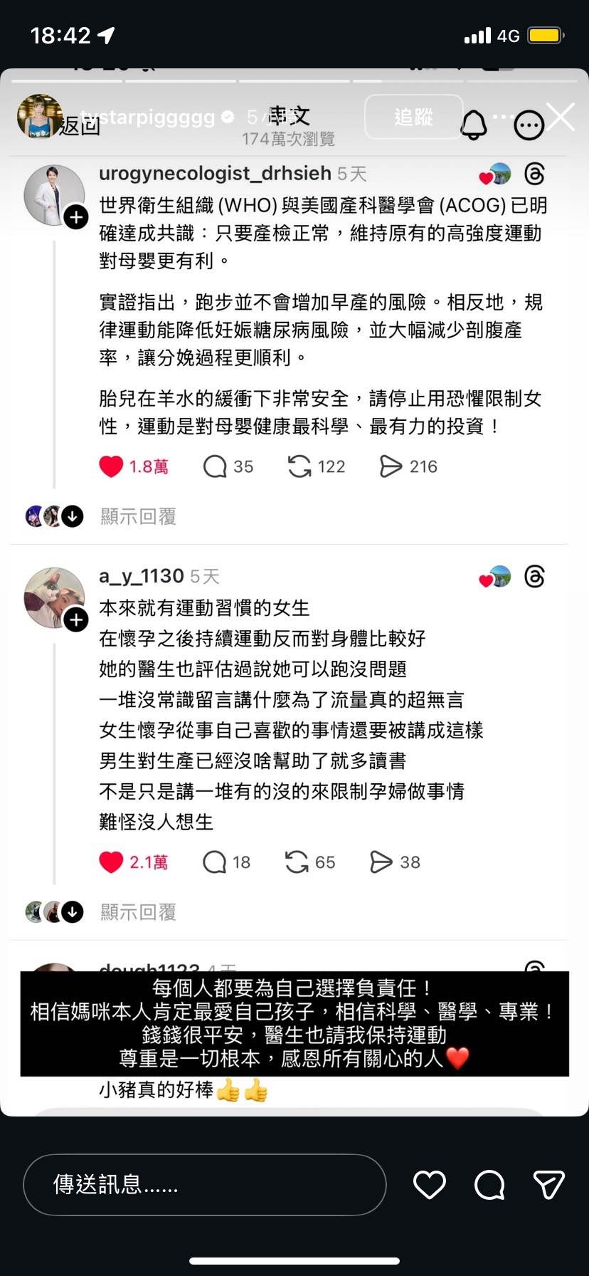 事實上,黃沐妍從孕前到懷孕期間一直維持運動習慣,此次路跑並非臨時起意。當時她順利完成5K,不少網友給予高度肯定,甚至有其他孕婦表示,看到她的分享後備受鼓舞,原本的焦慮與沮喪也因此減輕。