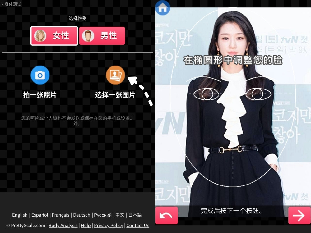 之後先以雙指放大及縮小,將照片先大致對準雙眼及臉型,完成後就可以按「向右」的箭頭以示完成。