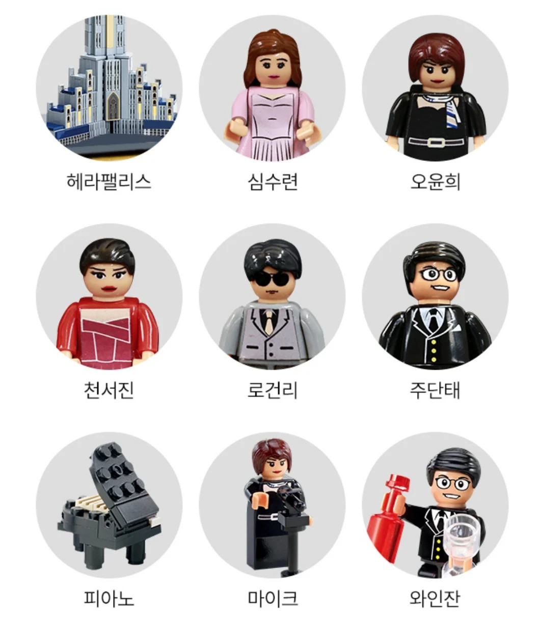 除了氣派又豪華的「赫拉皇宮」,官方也隨著積木推出《上流戰爭》的角色公仔,包括千書珍、吳允熙、沈秀蓮、朱丹泰以及羅根李5大角色,甚至還附有鋼琴、香檳杯、酒瓶、麥克風...等小道具,讓大家能重現奢華的劇中場景!