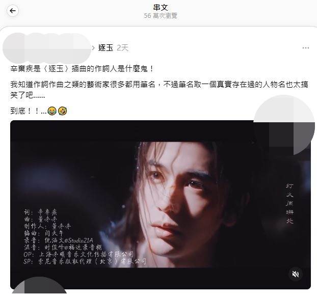 有網友追看《逐玉》時,發現劇中愛情主題曲〈眾裡尋他千百度〉作詞人,竟取了古人姓名「辛棄疾」,透過Threads表示,創作者取藝名或筆名,直接使用歷史真實存在人物姓名的行為,實在過於搞笑。