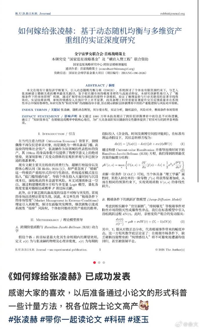 張凌赫以古裝陸劇《逐玉》落難侯爺角色爆紅,一舉一動成焦點。現在更有迷妹為了他寫出一篇創意論文,以自稱「全宇宙夢女聯合會‧首席戰略策士」發表名為《如何嫁給張凌赫:基於動態隨機均衡與多維資產重組的實證深度研究》的學術論文,且表示「本研究受『全國追星戰略基金』及『橫店入贅工程』共同資助」。