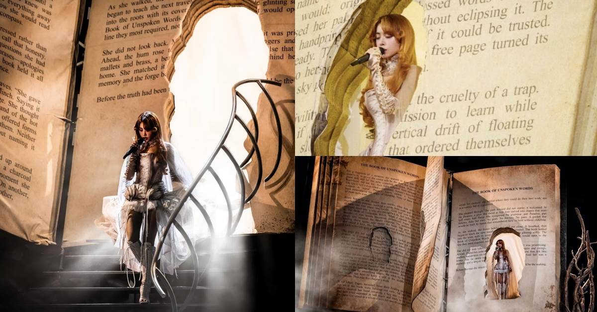 - 9. 巨型泛黃古書:蔡依林從翻頁巨大古書破洞裡,隨著歌聲「破頁而出」,呈現「書中顏如玉」夢幻造景。這座造價高達2千萬元台幣,頁面特別印上「THE BOOK OF UNSPOKEN WORDS」(未言之書)以及「BEFORE THE TRUTH」(真相之前)章節文字,和專輯寓言的神話與童話色彩,緊密結合,視覺張力出采,令人難忘。